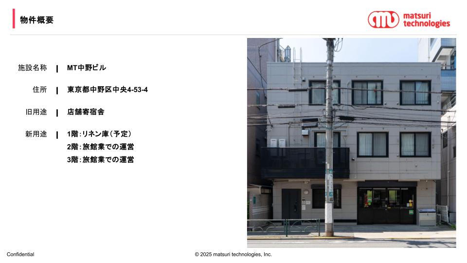 ソフトウェアを主軸に、空間の価値を最大化するソリューション「StayX」を運営するmatsuri technologies株式会社(本社:東京都新宿区)は、中野駅徒歩5分の3階建て読売新聞販売店をリノベーションし、2階と3階にそれぞれ1室ずつ計2室の客室を備え、アパートメントホテル『MT 中野ビル』として開業いたしました。