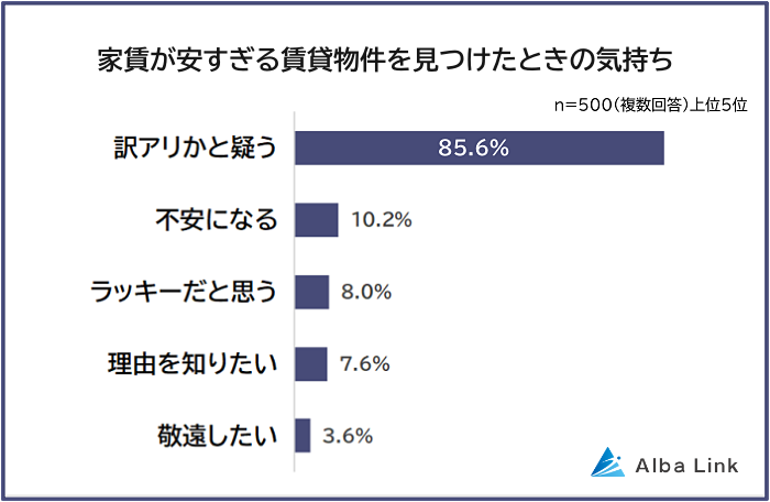 全国の男女500人に「家賃が安すぎる賃貸物件を見つけたときの気持ち」を聞いたところ、ダントツは「訳アリかと疑う(85.6%)」でした。