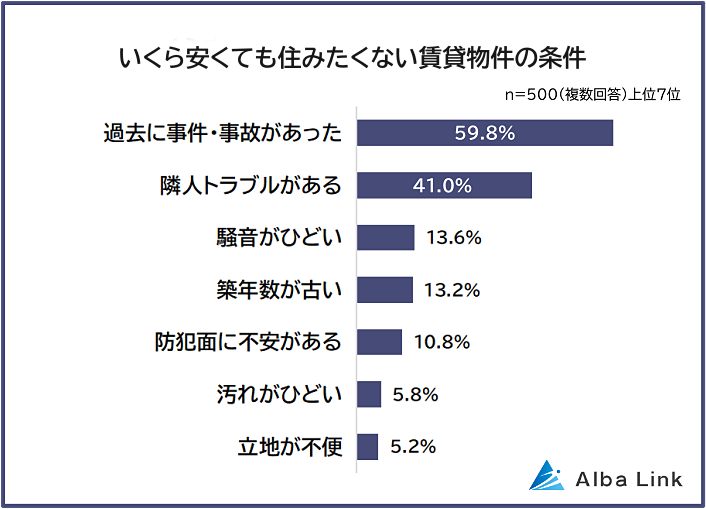 今回、株式会社AlbaLink( https://albalink.co.jp/ )が運営する訳あり物件買取プロ( https://wakearipro.com/ )は、全国の男女500人を対象に「家賃が安すぎる賃貸物件で気になること」についてアンケート調査を実施しました。