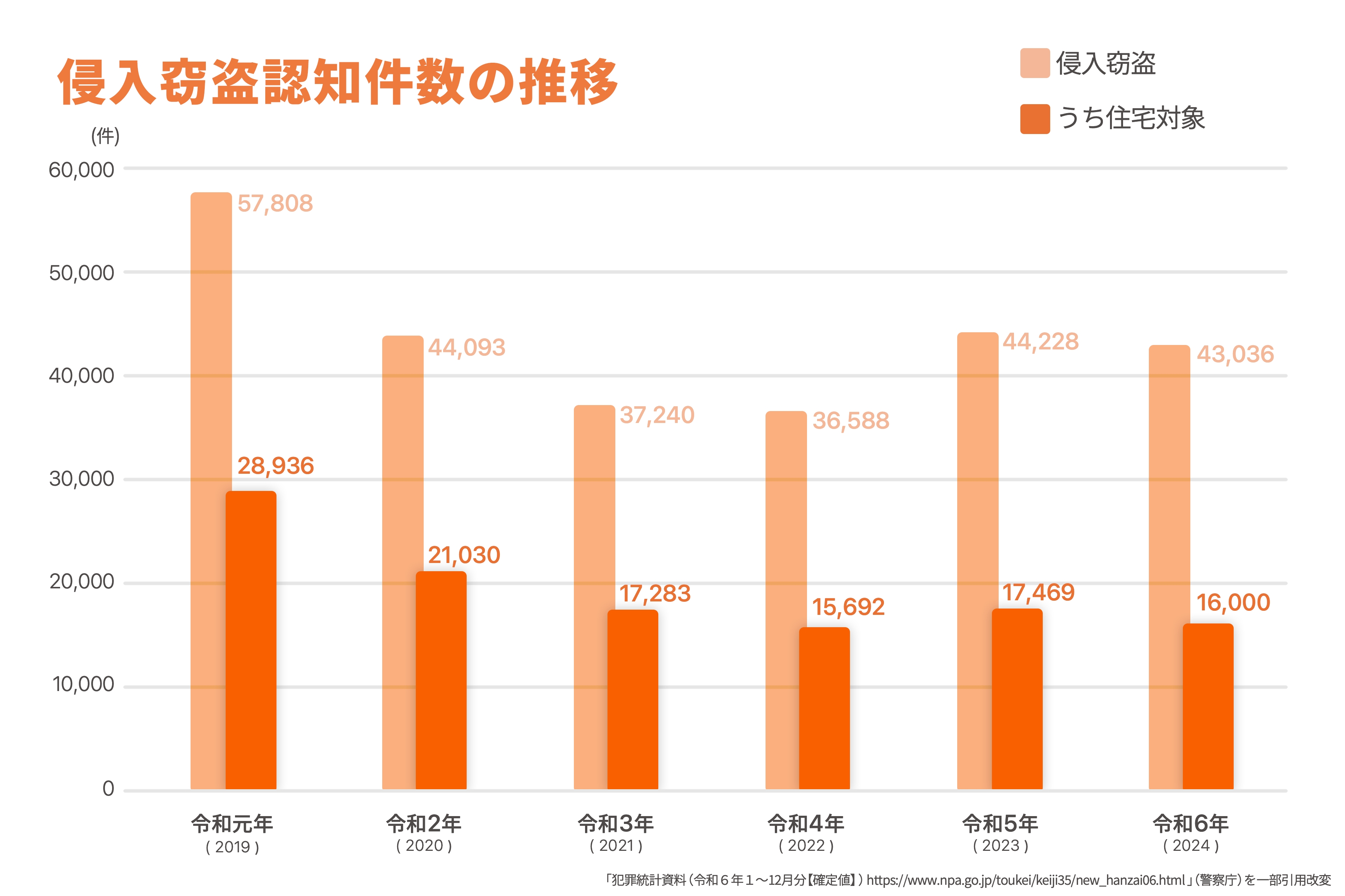 警察庁の「住まいる防犯110番」によると、侵入窃盗の認知件数は平成14(2002)年 をピークに減少が続いていましたが、令和5年には4万4,228件と、前年比で20.9%も増加しました。