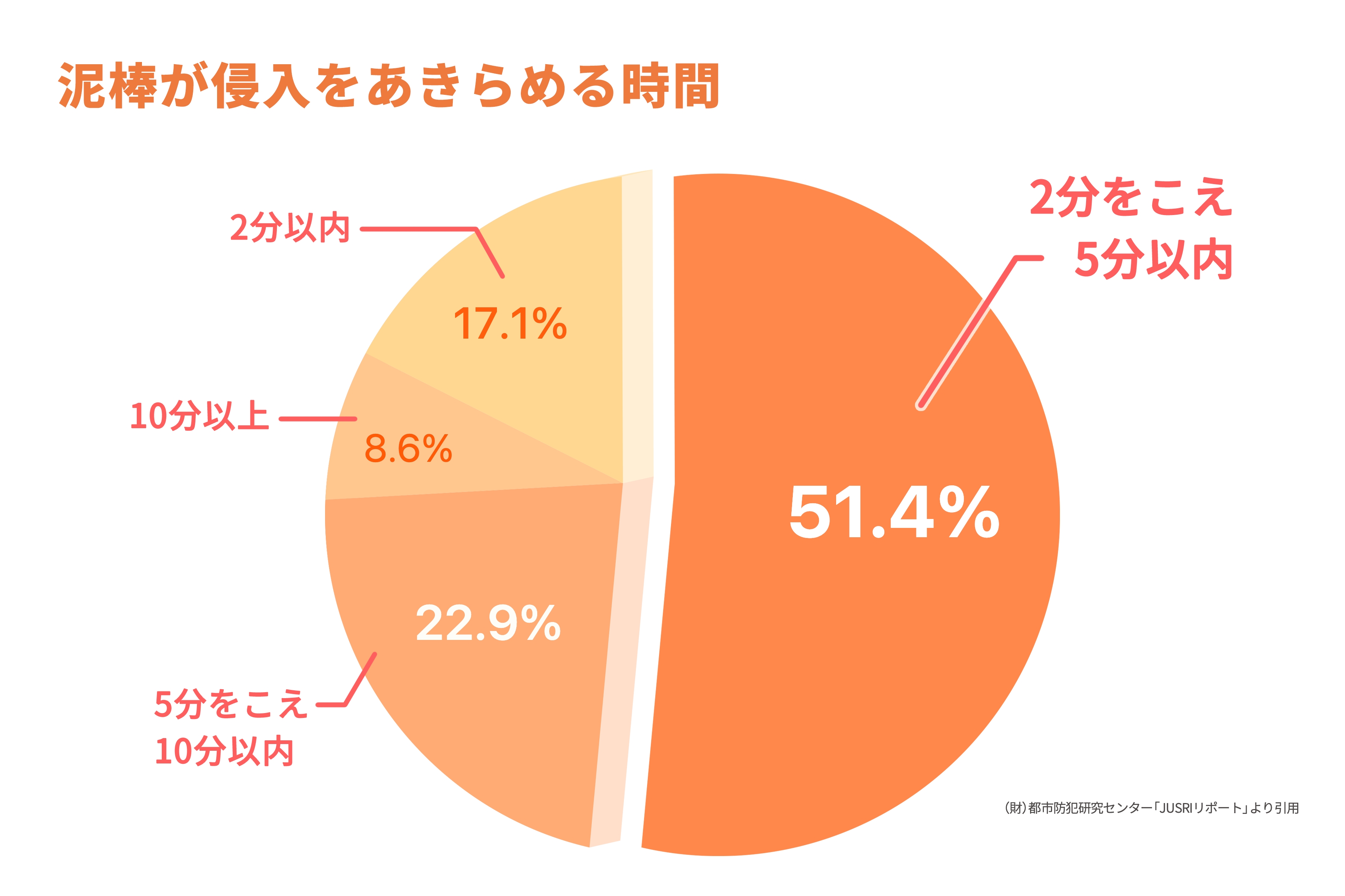 都市防犯研究センターの調査によると、元泥棒の約7割が「侵入に2〜5分以上かかると犯行をあきらめる」と答えています。つまり、建物の防犯性能を高めれば、侵入されるリスクを大きく減らすことが可能であり、安心・安全な暮らしを守るためにも耐久性の高い防犯設備の導入が重要といえます。