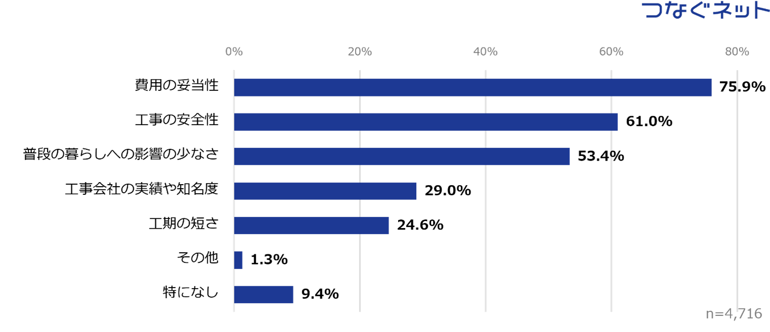 マンション住民に「マンションの大規模修繕で重視すべきポイント」を尋ねたところ、75.9%が「費用の妥当性」と回答しました。毎月支払っている修繕積立金が使われるため、適正な費用であることを重視する傾向がうかがえます。