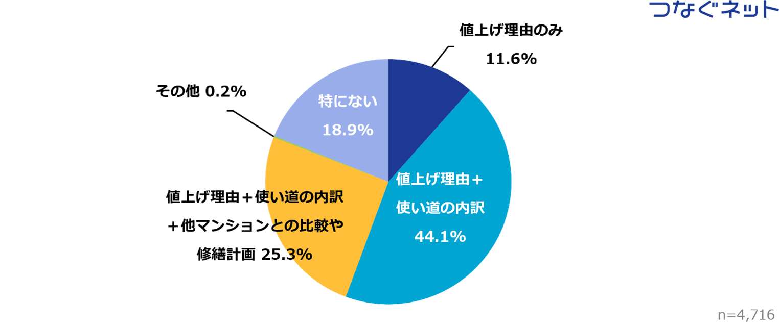 修繕積立金が値上げされることになったら、69.4%が「値上げ理由に加えて使い道の内訳まで説明を求める」と回答