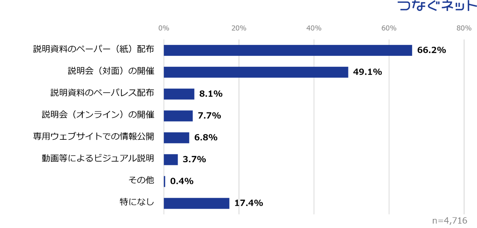「修繕計画や費用に関する情報がどのような方法で周知されているか」については、「説明資料のペーパー(紙)配布」が66.2%、「説明会(対面)の開催」が49.1%と、現状ではオフラインの手段が主流であることがわかります。