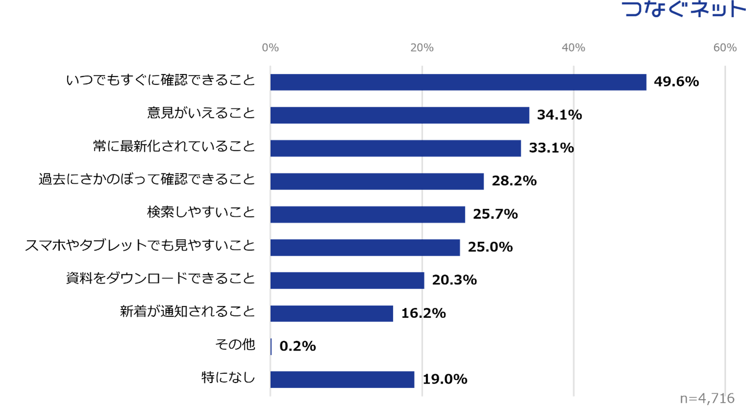 さらに、「修繕計画や費用に関する情報について、どのようなことができると便利か」を尋ねたところ、49.6%が「いつでもすぐ確認できること」と回答しました。加えて、「意見がいえること」や「常に最新化されていること」なども上位に挙がっています。オンラインでの情報提供もあわせて行うことで、より効率的な情報共有につながる可能性があります。