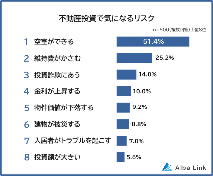 今回、株式会社AlbaLink( https://albalink.co.jp/ )が運営する不動産投資の森( https://2do-3.com/ )は、全国の男女500人を対象に「不動産投資で気になるリスク」についてアンケート調査を実施しました。