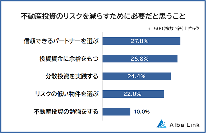 「不動産投資のリスクを減らすために必要だと思うこと」を聞いたところ、1位は「信頼できるパートナーを選ぶ(27.8%)」でした。2位「投資資金に余裕をもつ(26.8%)」、3位「分散投資を実践する(24.4%)」、4位「リスクの低い物件を選ぶ(22.0%)」までが、20%以上を集めています。