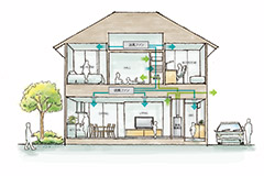 断熱性能や気密性の高い「住友林業の家」にルームエアコン1台と調湿機能付きの換気装置を組み合わせて温度と湿度を快適に保ち、子どもの健康に配慮した室内環境を作ります。空気が乾燥すると喘息症状の誘発や皮膚トラブルなど子どもの健康への影響が懸念されます。調湿機能で冬は乾燥を軽減し、梅雨の時期は室温を下げずに除湿します。VAV制御(可変風力制御)機能付きのオリジナル送風ファンで部屋ごとに風量が調節でき、就寝時は風量を抑えて子どもに適した睡眠環境が整えられます。
