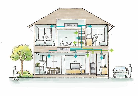 全館空調システムイメージ図(青色の矢印が空調、緑色が換気の流れ)