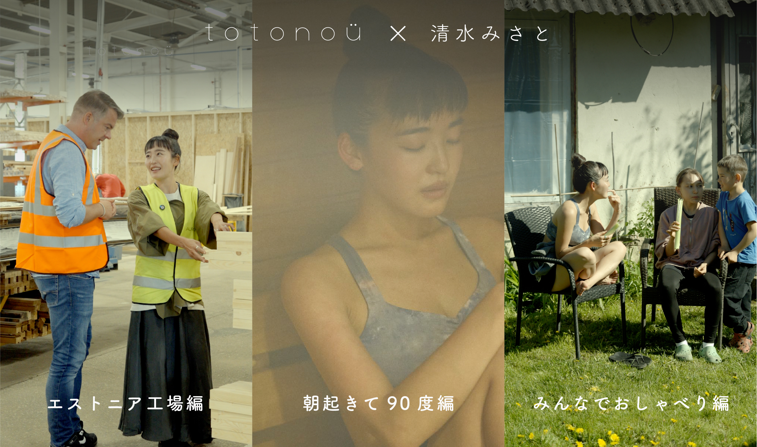 今回新たに公開したWeb CMは、「朝起きて90度」編、「エストニア工場」編、「みんなでおしゃべり」編の3本です。清水みさとさんがエストニアのサウナ工場を初めて訪問する様子や、自宅サウナの魅力を語るインタビューなどが盛り込まれており、totonoüが日本での実現を目指す『サウナと共にある暮らし』を表現する内容となっています。