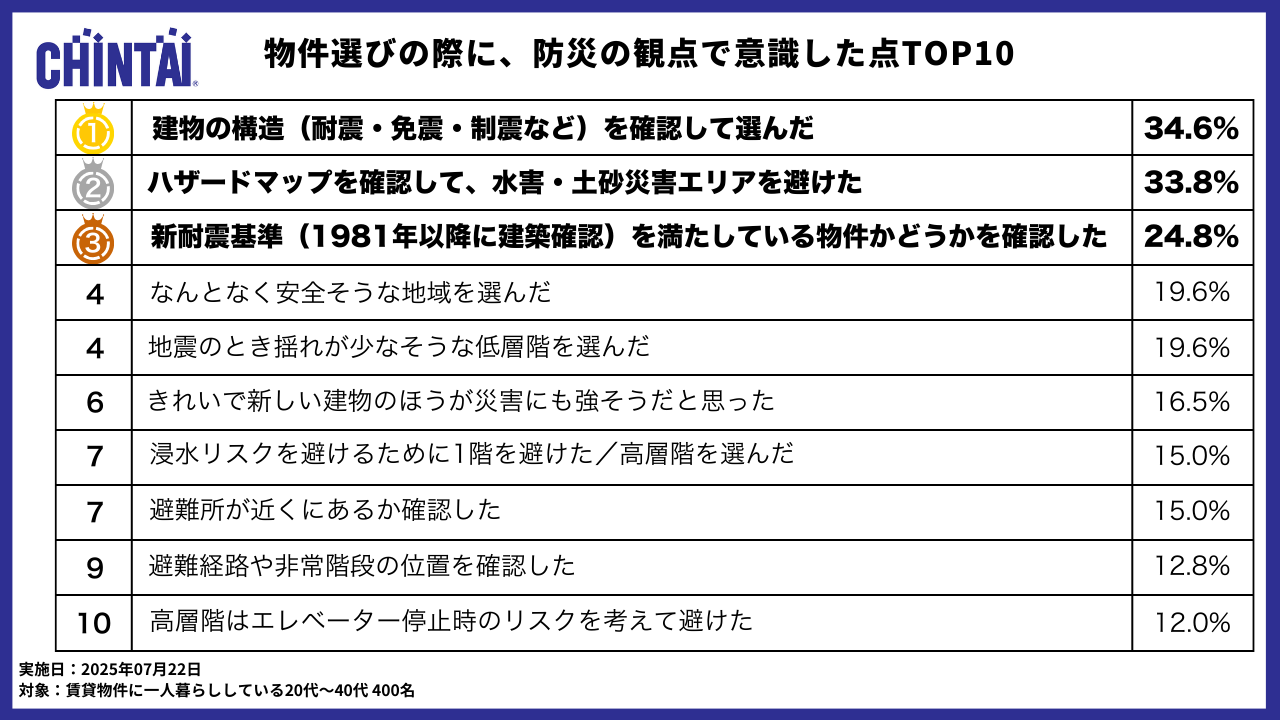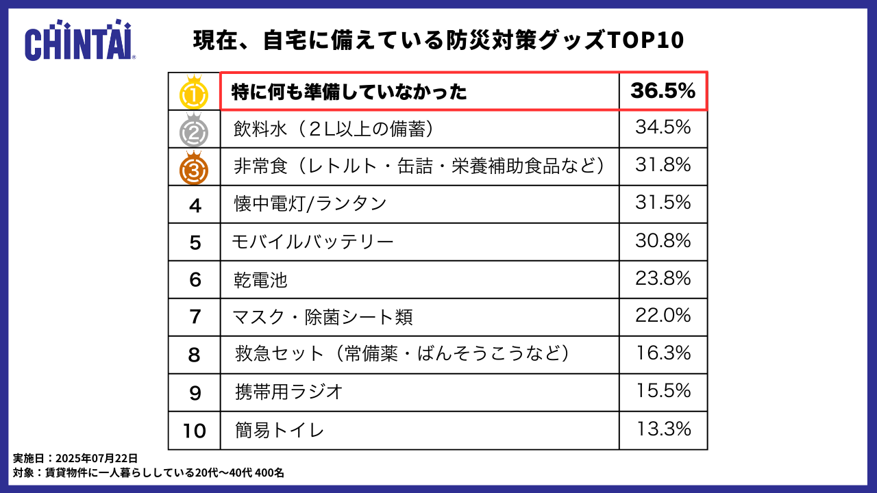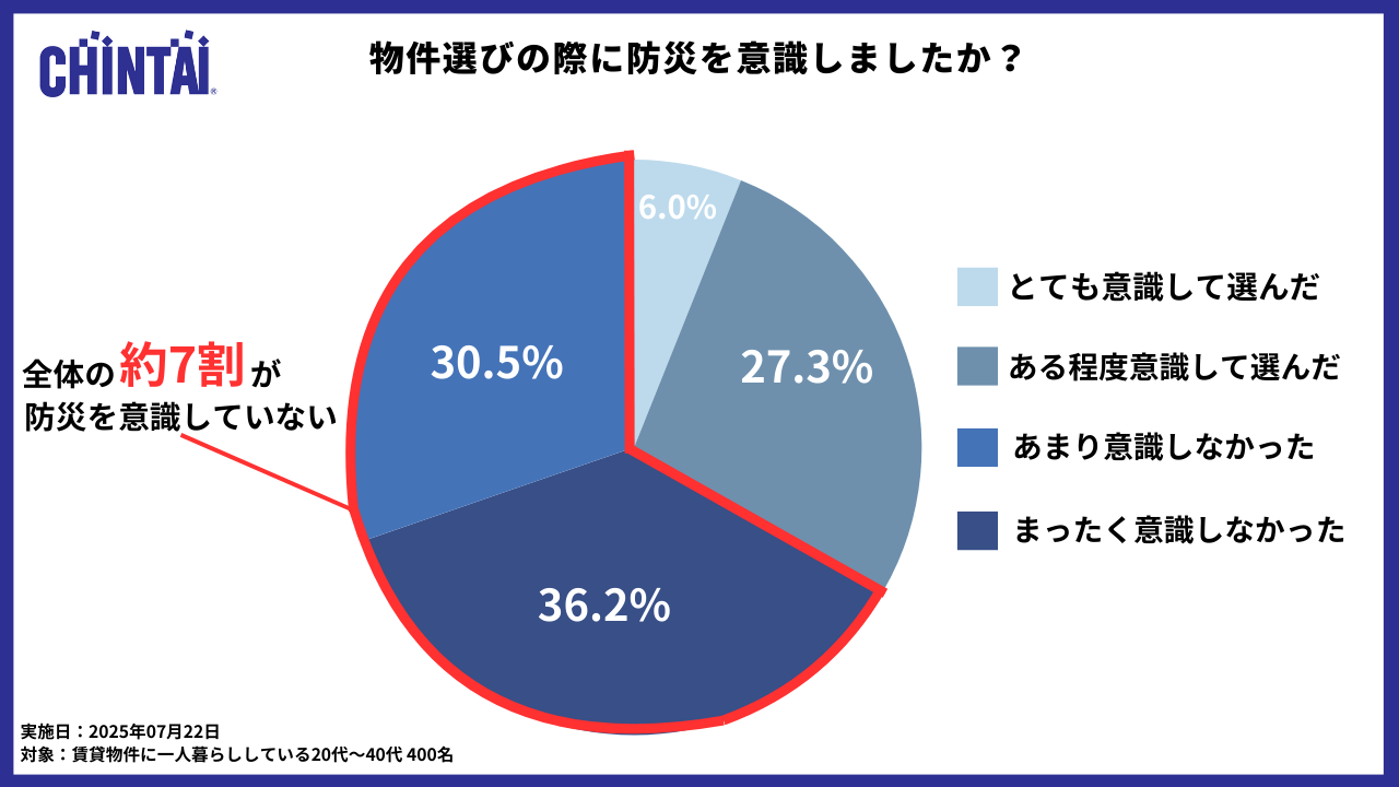 お部屋探しのリーディングカンパニー株式会社CHINTAI(本社 東京都港区、代表取締役社長 奥田倫也、以下 CHINTAI)は、9月1日の「防災の日」を前に、全国の賃貸物件で一人暮らしをしている20代~40代の男女400名を対象に、防災意識や実際の備えに関する調査を実施しました。