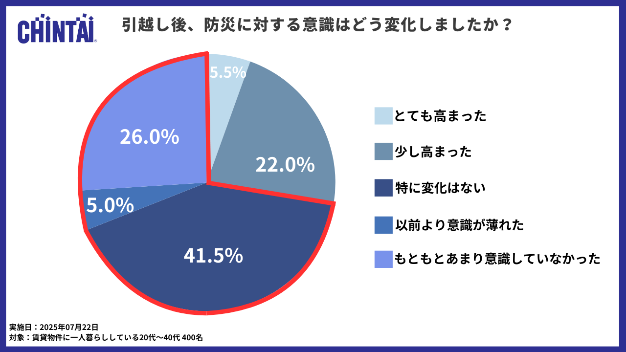 さらに、引越し後に防災意識が高まった人は約4人に1人にとどまり、多くの人が生活環境の変化を防災行動の見直しにつなげられていません。こうした結果から、賃貸で一人暮らしをする人に向けた、防災を暮らしの条件として日常的に意識させる情報提供や啓発の重要性が浮き彫りとなりました。