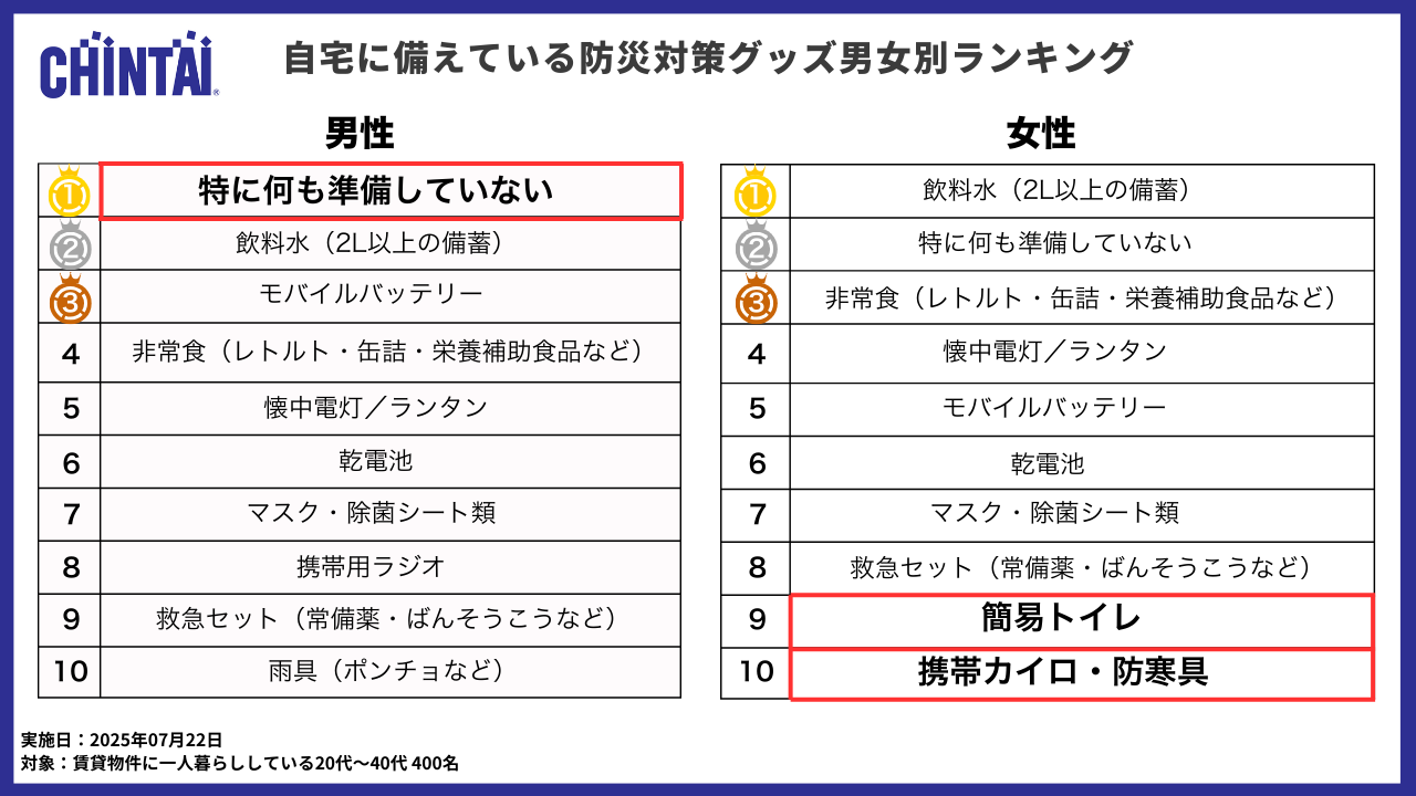 ・性別差では、男性は「特に何も準備していない」が最多。女性は飲料水や非常食など日用品系の備えが多く、男性には見られなかった「簡易トイレ」や「携帯カイロ・防寒具」もランクイン。