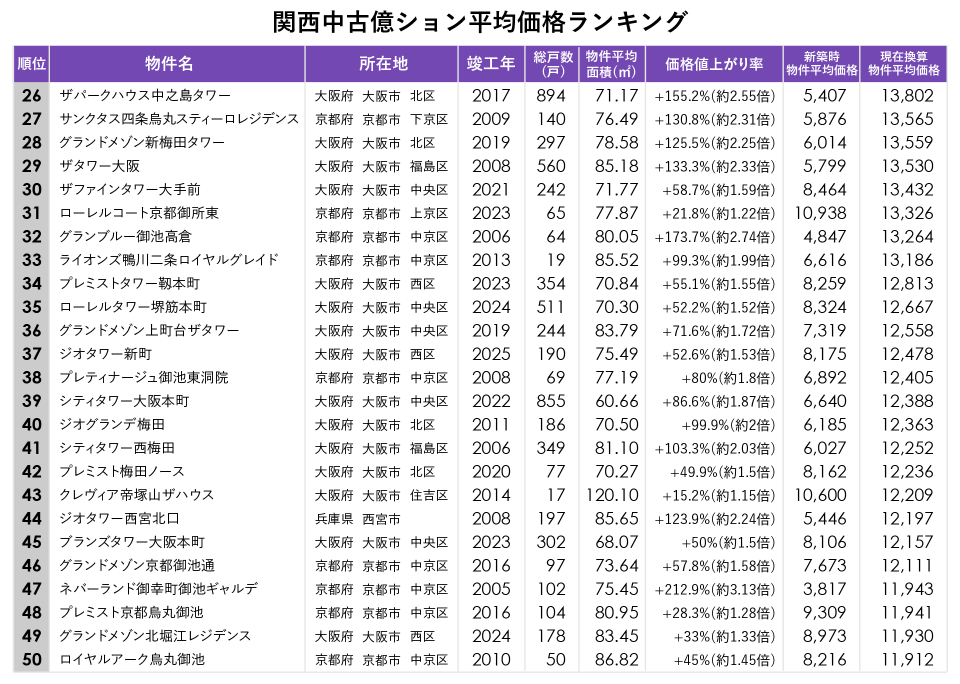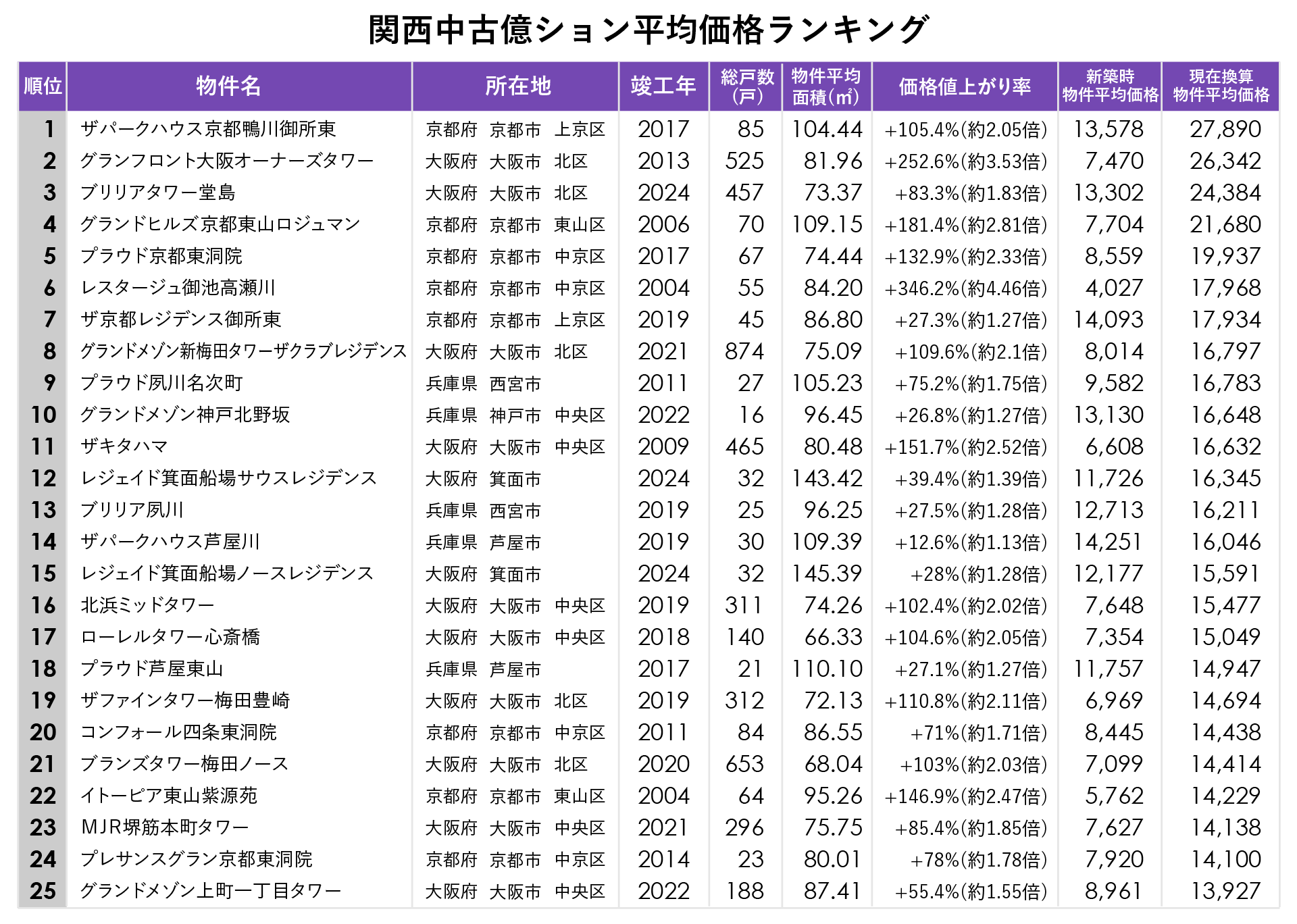 近年の不動産市場では、首都圏だけでなく関西エリアにおいてもマンション価格の高騰が顕著になっています。今回は、関西エリアの中古マンションに焦点を当て、2024年以降に関西2府4県で中古流通した中古マンションの流通住戸価格からその物件の中古物件平均価格を割り出し、中古物件平均価格が1億円以上のマンションの中から平均価格が高い順に50物件をランキング形式で掲載しました。