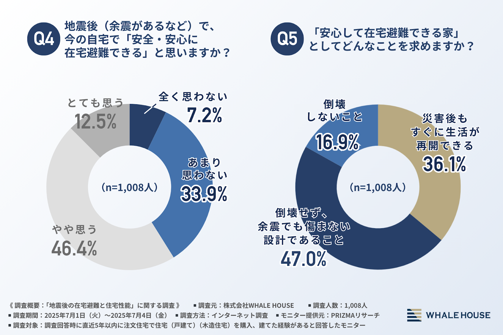 株式会社WHALE HOUSE(本社所在地:兵庫県神戸市、代表取締役:彦坂 達也)は、直近5年以内に注文住宅で住宅(戸建て)(木造住宅)を購入、建てた経験がある方を対象に、「地震後の在宅避難と住宅性能」に関する調査を実施しました。