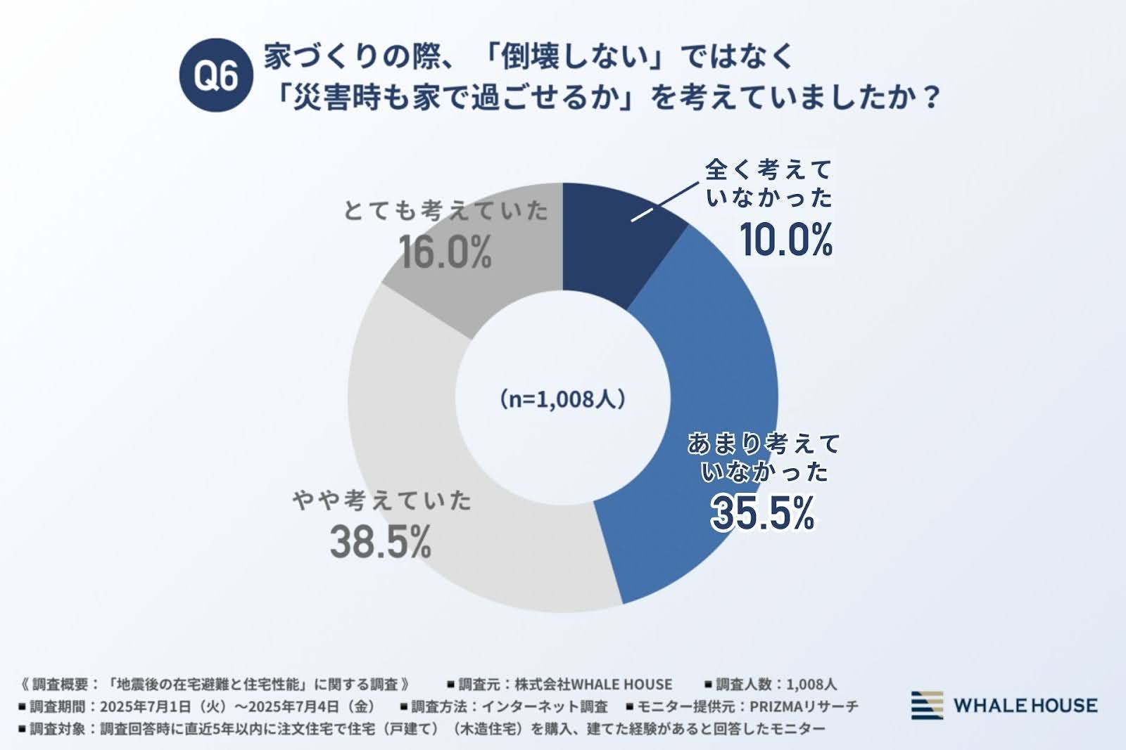「家づくりの際、『倒壊しない』ではなく『災害時も家で過ごせるか』を考えていたか」と尋ねたところ、以下のような回答結果になりました。