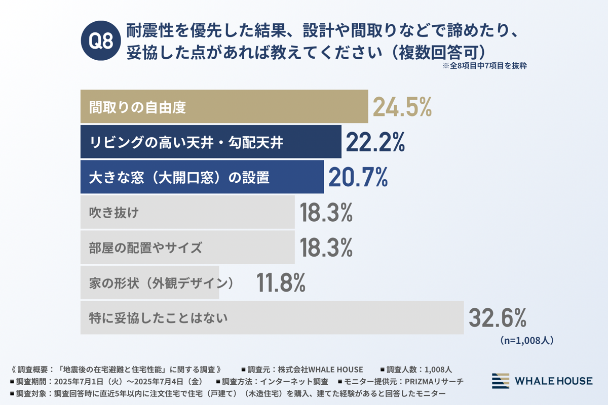 「耐震性を優先した結果、設計や間取りなどで諦めたり、妥協した点」について尋ねたところ、『間取りの自由度(24.5%)』『リビングの高い天井・勾配天井(22.2%)』『大きな窓(大開口窓)の設置(20.7%)』など、開放感やデザイン性に関わる要素での妥協が多く見られました。