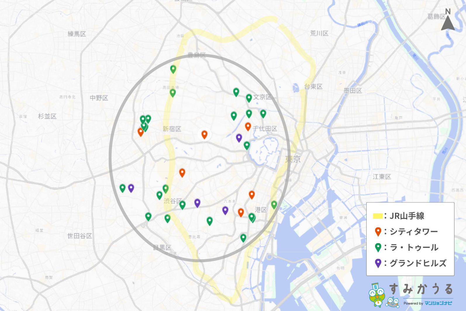 住友不動産が展開する高級賃貸「ラ・トゥール」シリーズは、東京23区の中でも特にステータス性・利便性・資産価値の高いエリアに限定して配置されています。そのエリア分布を可視化すると、皇居を中心とした“同心円構造”の内側に集中していることがわかります。