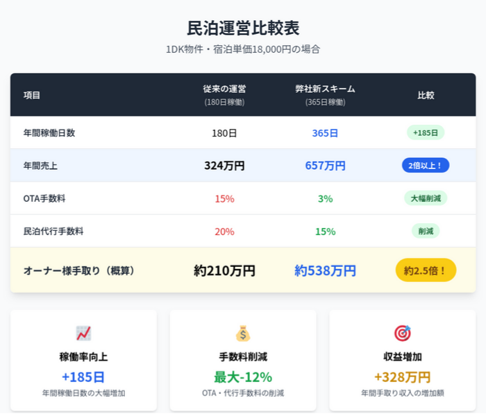 ご覧の通り、稼働日数が倍増するだけでなく、当社独自のルートによりOTA手数料を大幅に圧縮。さらに代行手数料も見直すことで、オーナー様の手取り額を最大化することに貢献します。