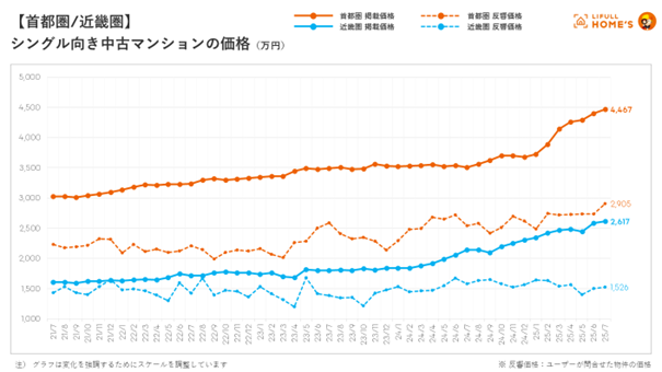 シングル向き中古マンションの平均掲載価格は、首都圏(東京都、神奈川県、埼玉県、千葉県)で4,467万円(前年同月比127.4%)、近畿圏(大阪府、兵庫県、京都府)で2,617万円(前年同月比122.3%)となり、首都圏、近畿圏ともに前月に続いて2021年2月の計測開始以降の過去最高価格を更新しました。