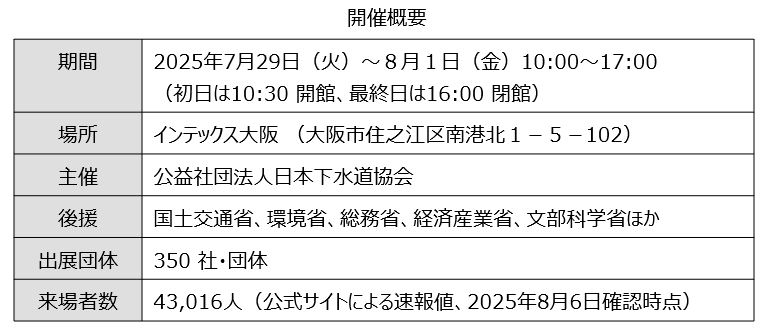 第37回目を迎える今回は、2025年7月29日から8月1日にインテックス大阪で開催され、350社・団体が参加しました。日本管財環境サービスは、この度上下水道事業開始から50年、分社化20年の節目となることから今回初めて出展し、 全国130拠点以上でインフラ管理を展開している当社の実績や最新の取組み、販売商品等を紹介しました。
