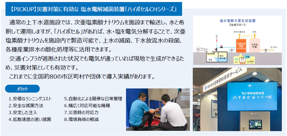 また、塩水電解滅菌装置「ハイポセル」のデモ機を展示。薬品を使わず次亜塩素酸ナトリウムを生成できる装置は、来場者から高評価を得ました。