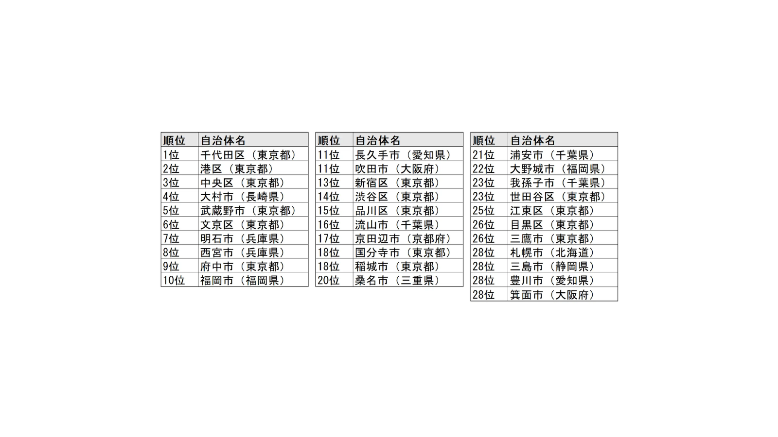 1位・長久手市(愛知県) 2位・桑名市(三重県) 3位*・三島市(静岡県)、豊川市(愛知県)