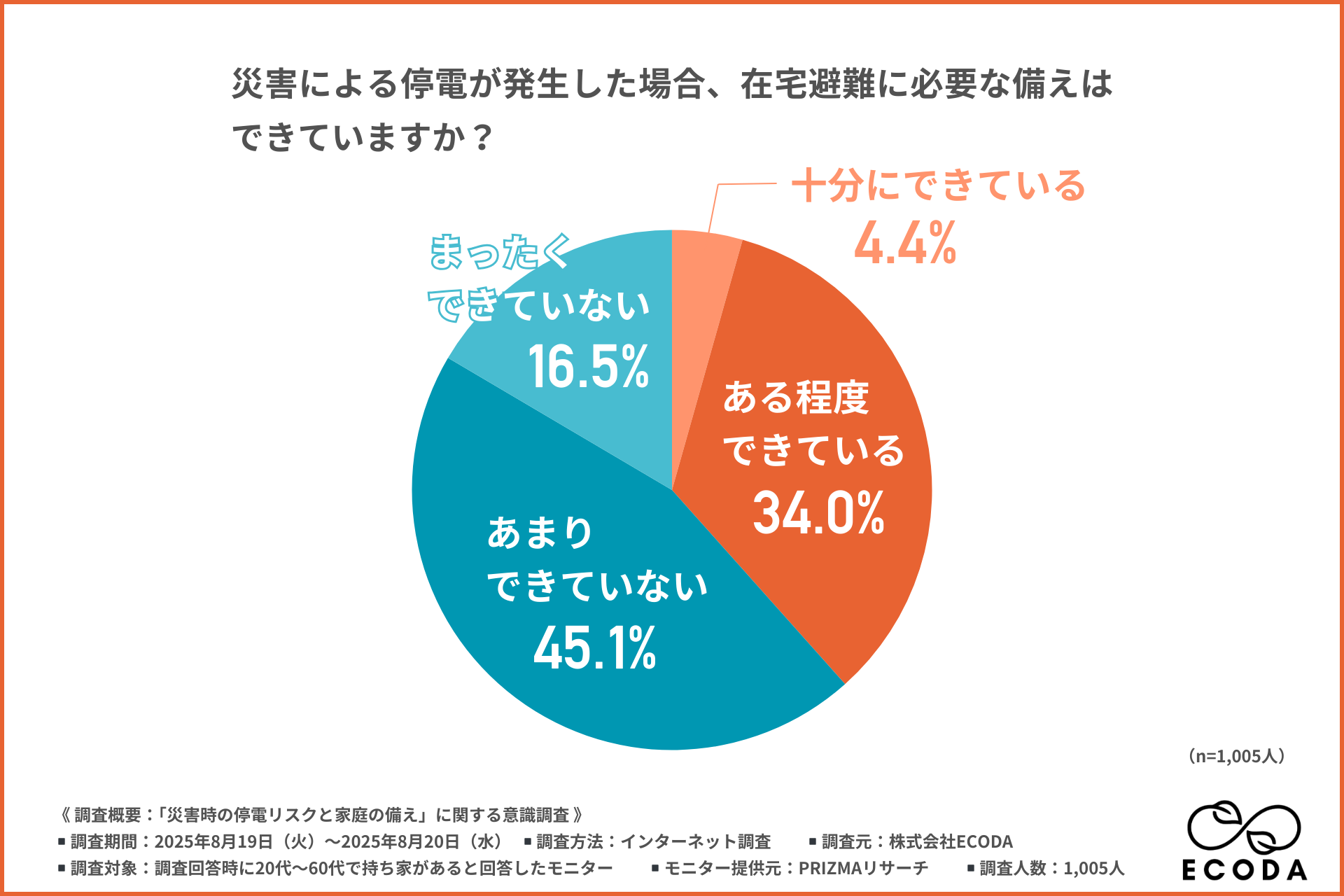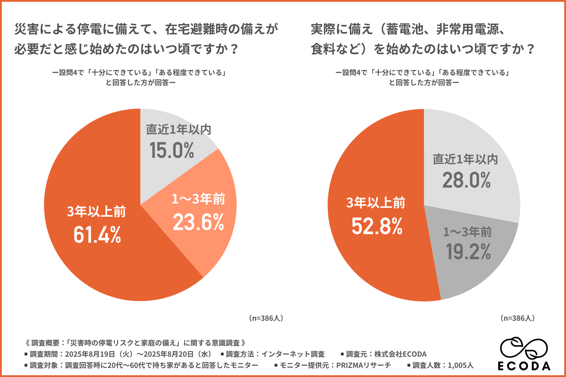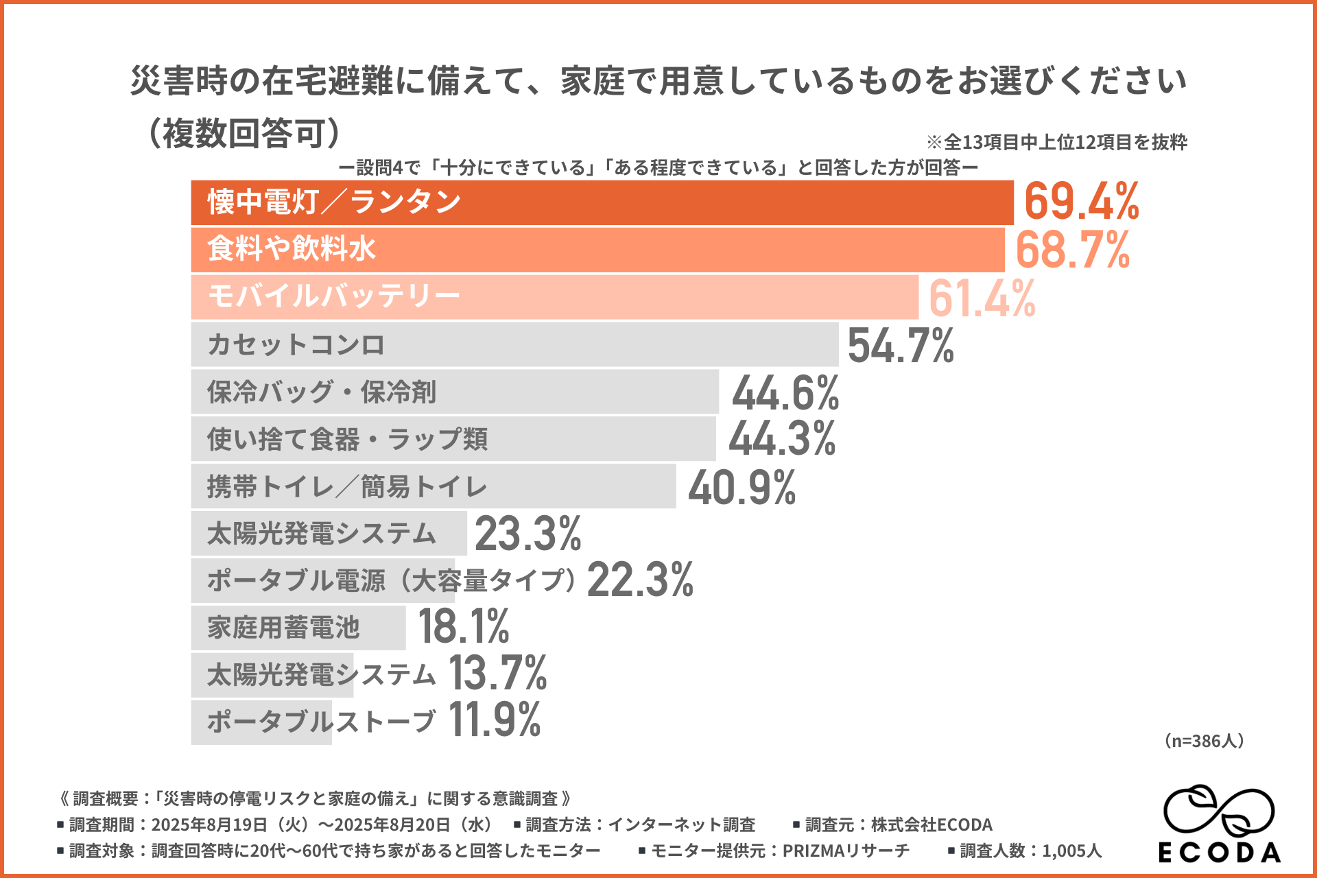 株式会社ECODA(本社:東京都渋谷区、https://ecoda-corp.com/)は、全国の20代~60代で持ち家がある方を対象に、「災害時の停電リスクと家庭の備え」に関する意識調査を行いました。