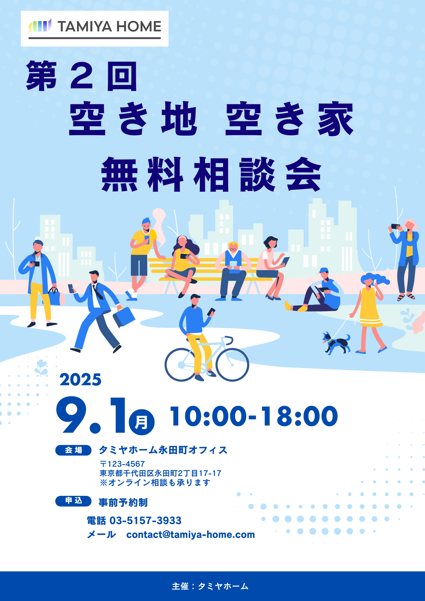 株式会社タミヤホーム(本社:埼玉県所沢市中富1282-4)は、東京事務所(東京都千代田区永田町2丁目17-17)にて、2025年9月1日(月)に「第2回 空き地・空き家無料相談会」を開催します。