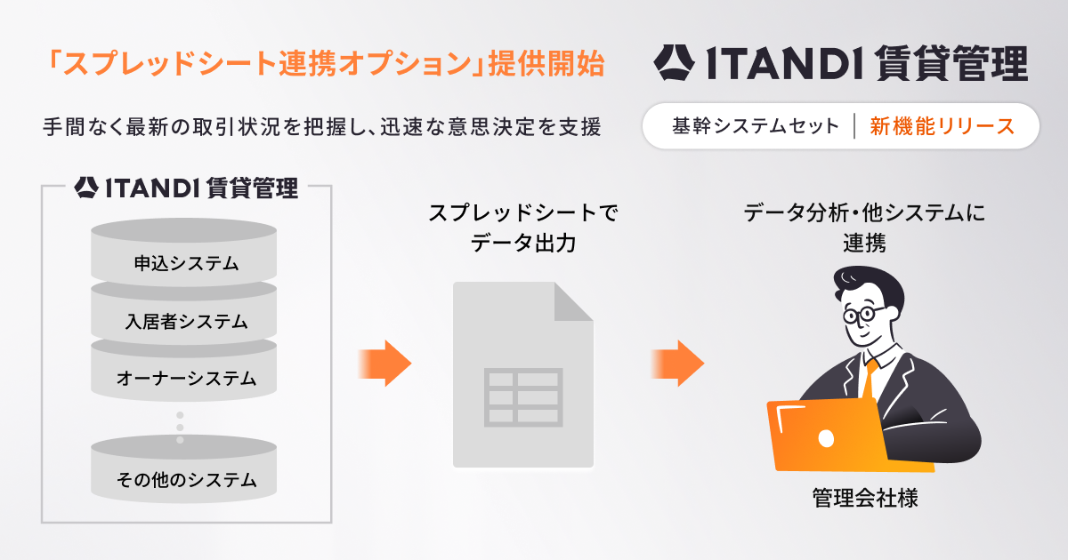 今回提供を開始する「スプレッドシート連携オプション」は、当社として初めての不動産賃貸管理のデータ提供型サービスです。本機能により、管理会社は「ITANDI 賃貸管理」に入力された、契約・物件・家主・入出金情報など賃貸管理全般の自社データをスプレッドシートに出力できます。出力したデータは、解約率や入居率などの指標集計、自社に合わせた分析、業務進捗管理、他社システムとの連携、帳票作成など幅広く活用可能です。