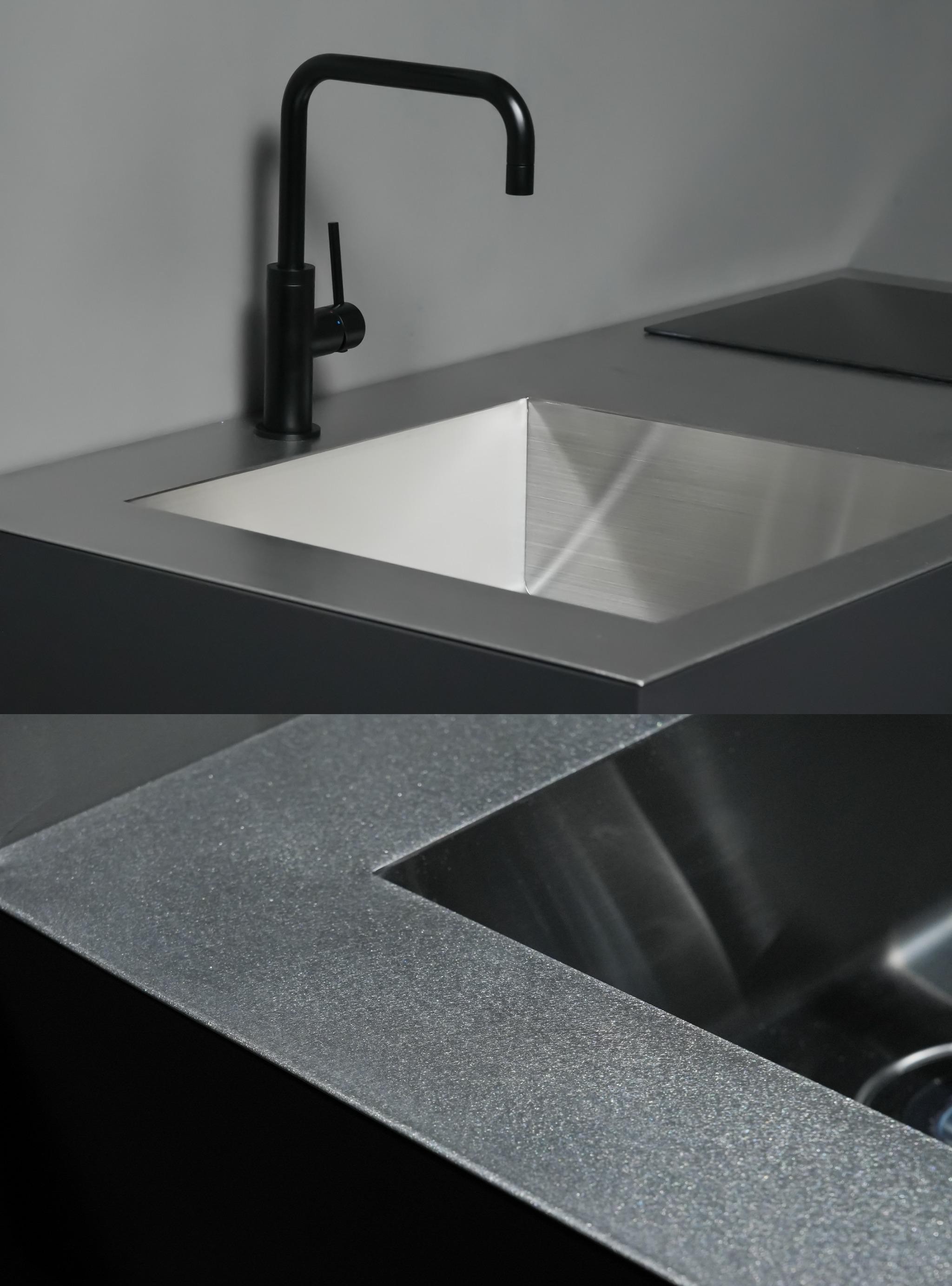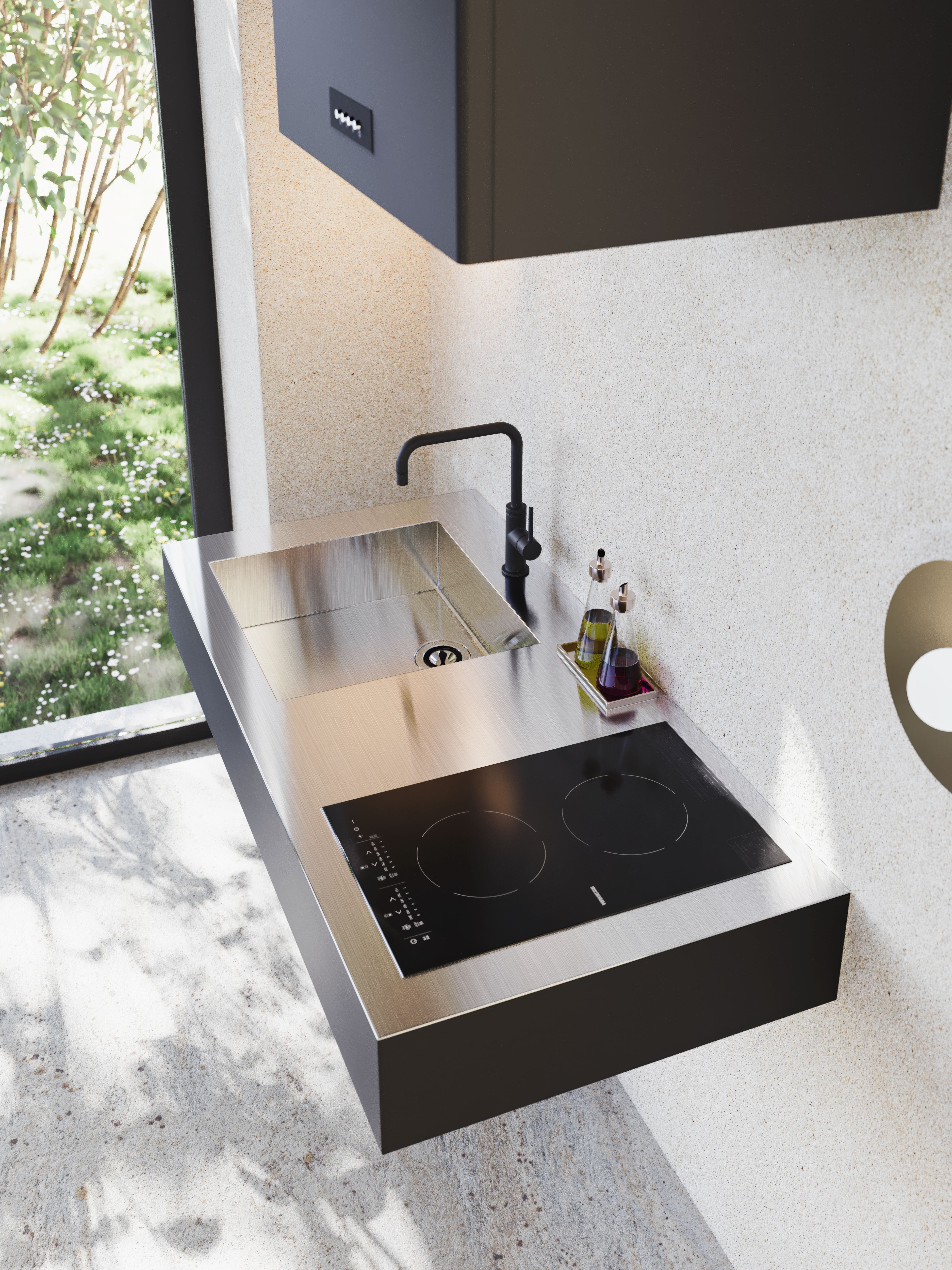 Levlocは、極薄のステンレスカウンターが描くすっきりとしたシームレスデザインと、最小限の構成でありながら最大限の美しさを実現する、新しいキッチンのかたちです。