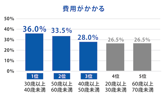 防災について取り組みが難しい点として最も多かったのが「費用がかかる」で30%を超えています。年代別の分析では、「費用がかかる」と回答した割合は30代が最も高く、60代が最も低くなっています。一般の消費者は、コスト面で無理せずできる備えや防災の取り組み方に関する情報提供を求めていることが読み取れます。