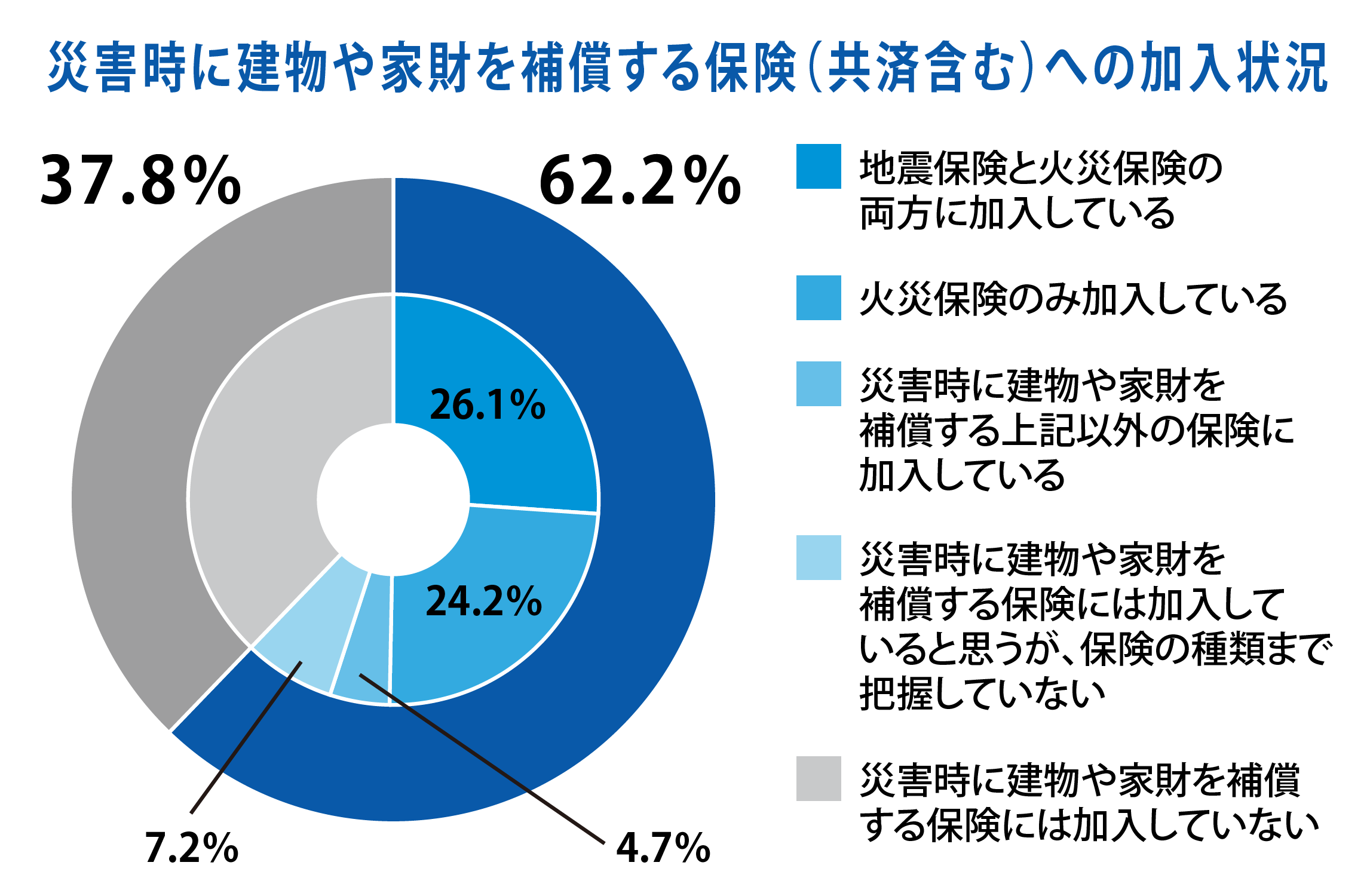 何らかの保険などに加入されている方が62.2%という結果となりました。内訳では「地震保険と火災保険の両方に加入している」と回答した方が26.1%で最も多く、次いで「火災保険のみ加入」と回答した方が24.2%となっています。