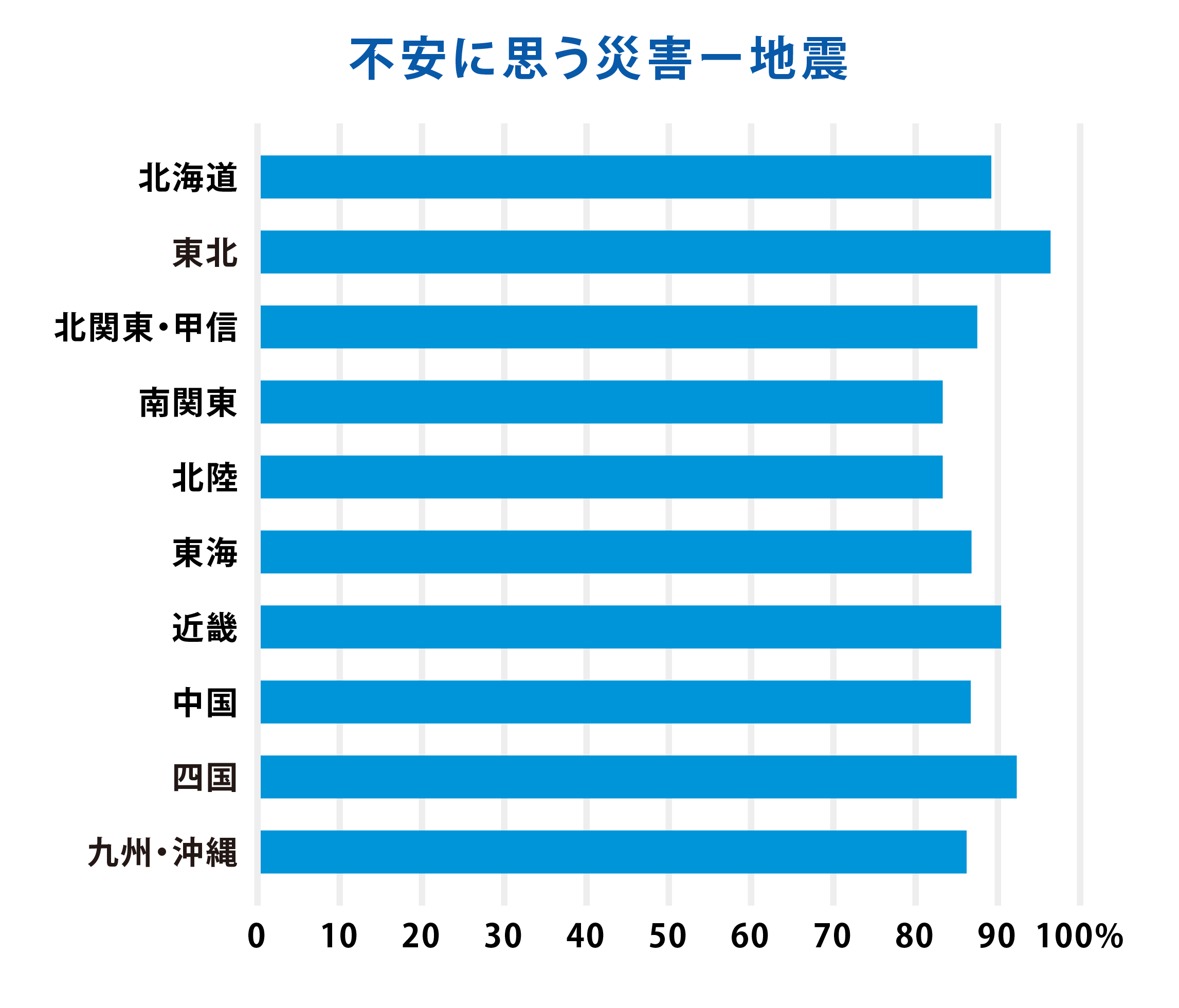 地域別の結果では、東北地方、近畿地方、四国地方において地震を不安に感じる割合が90%を超えています。