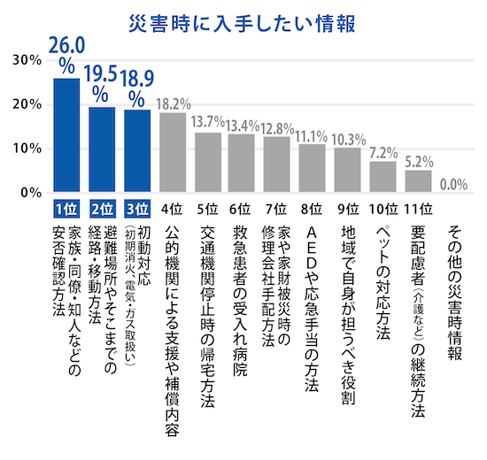 災害時に入手したい情報は「安否確認方法」が1位となっています。LINEの「安否確認」機能や「Yahoo!防災速報」といったアプリを活用することで、ご家族や知人の安否や位置情報が確認できますので、活用してみてはいかがでしょうか。
