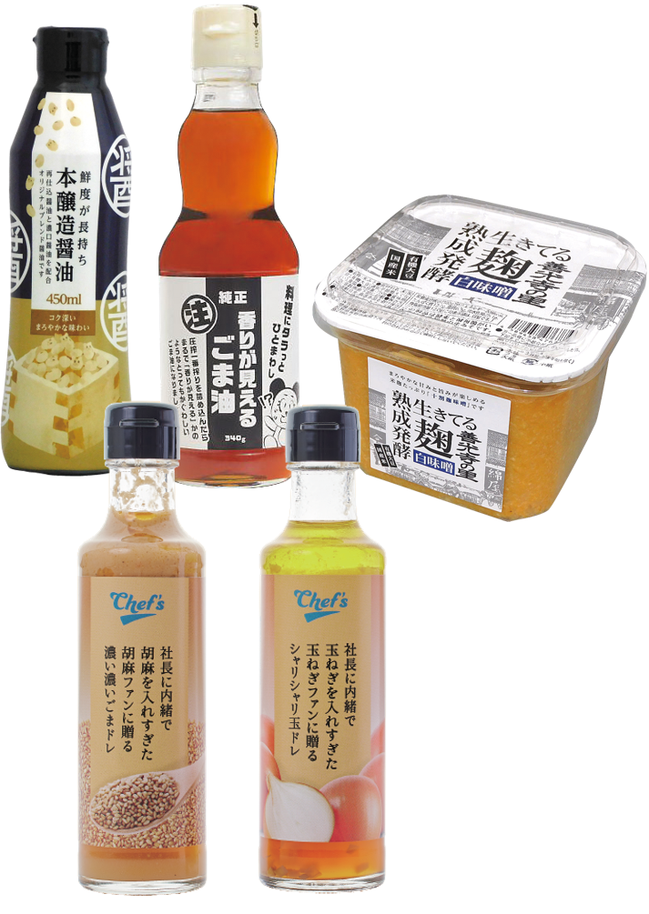 …再仕込醤油と濃口醤油を配合したオリジナルブレンドの醤油、鮮度長持ちのこだわり容器入り!