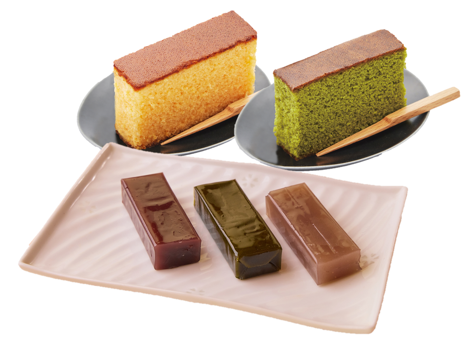 新登場した胡蝶庵のようかん3種と、信州産卵と宇治の高級抹茶を使用したカステラのセット。