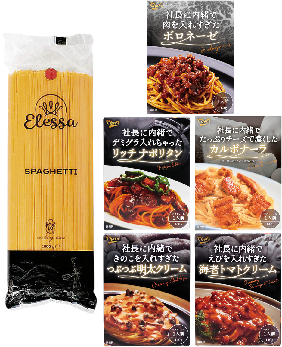 トルコから直輸入したスパゲッティと綿半のシェフが監修したパスタソース5種のセット。