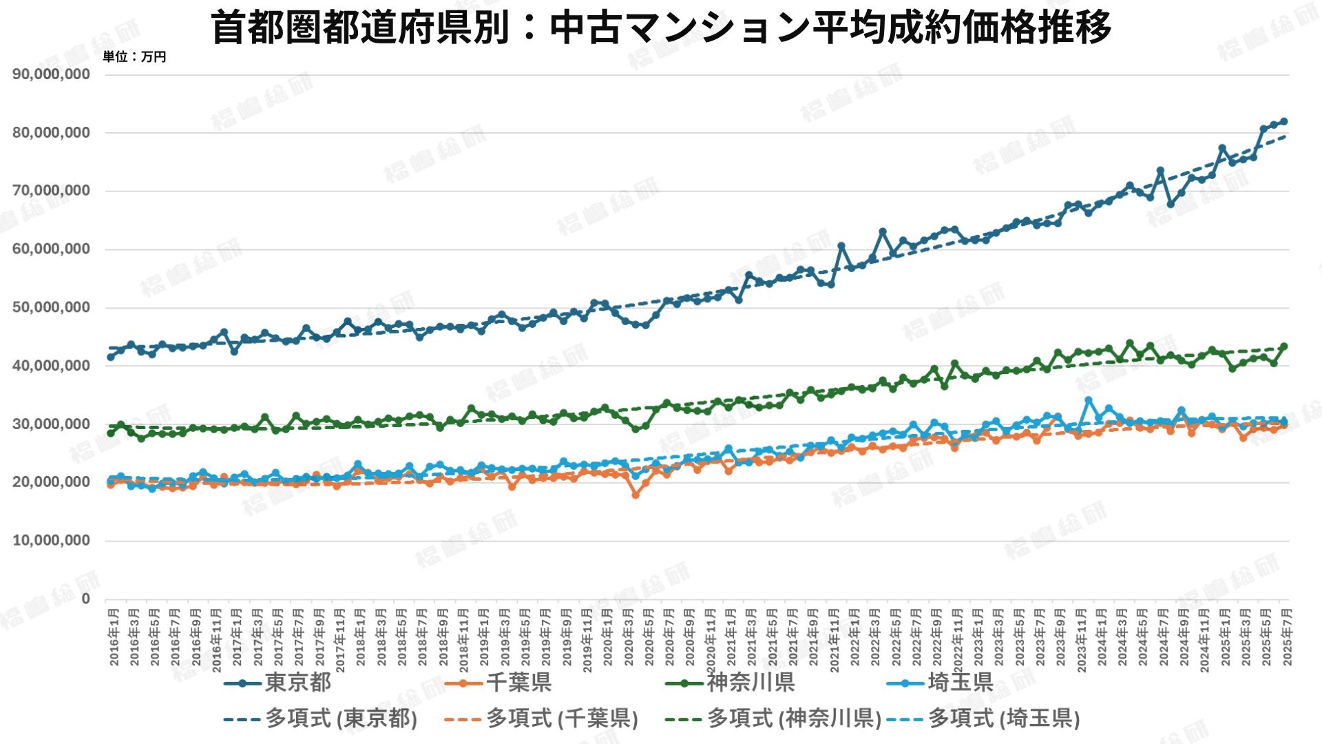 一方、首都圏の住宅市場の動向にも変化が見られます。東京都を除く埼玉県、千葉県、神奈川県の平均購入価格は、2024年前半までは上昇傾向にありましたが、その後の推移は地域ごとに差が生じています。具体的には、埼玉県と千葉県では平均購入価格が微減傾向となり、神奈川県ではほぼ横ばいで推移しています。
