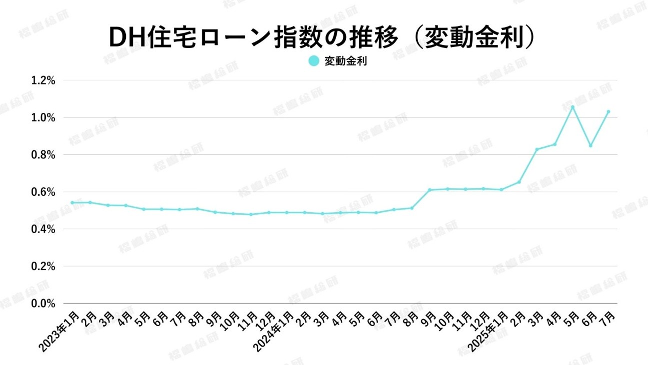 ただし「DH住宅ローン指数」で見ると、変動金利は1.031%と、前月の0.847%から上昇しました。前年同月(0.504%)と比べても高い数字です。