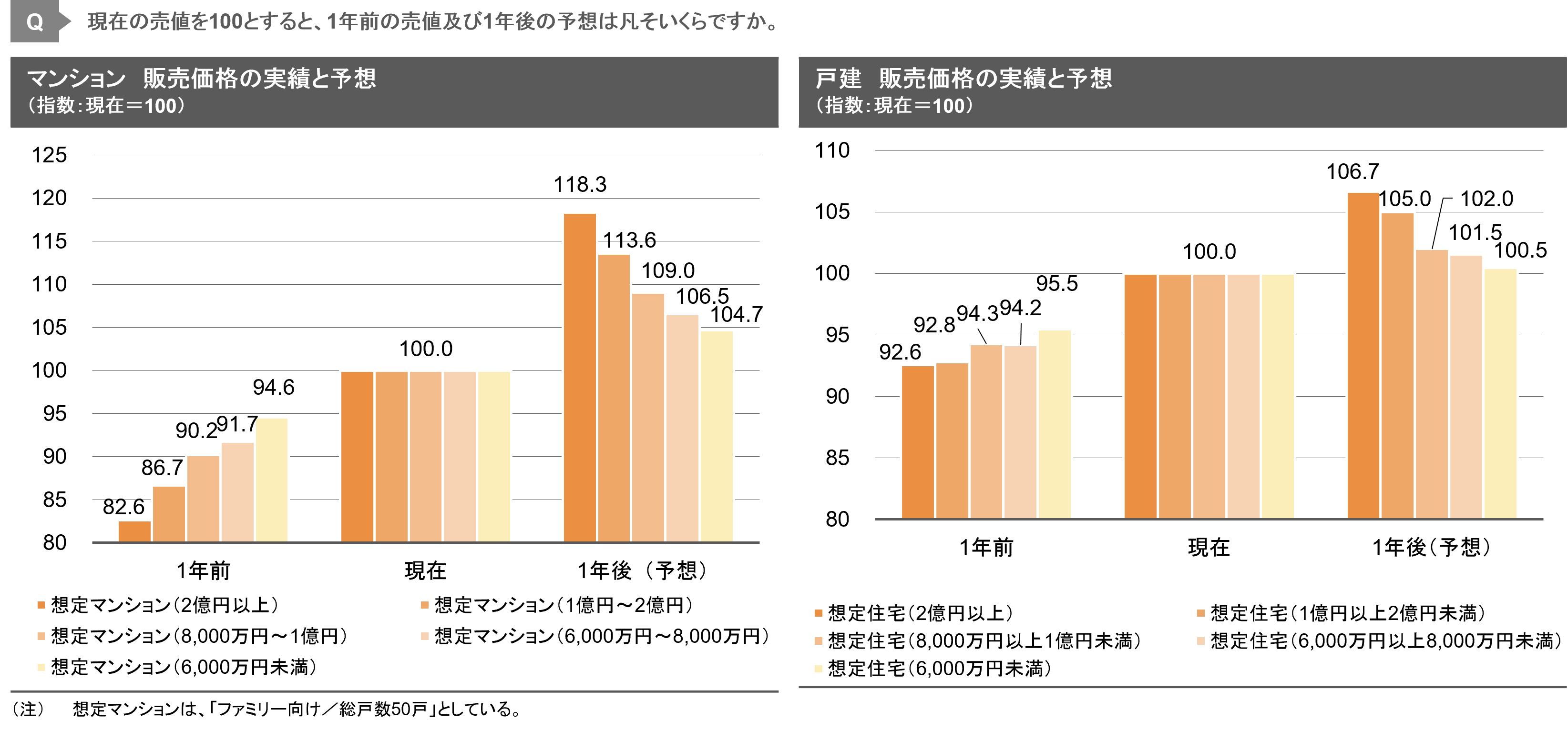 販売価格の実績と予想について、マンション市場・戸建て市場のいずれでも、