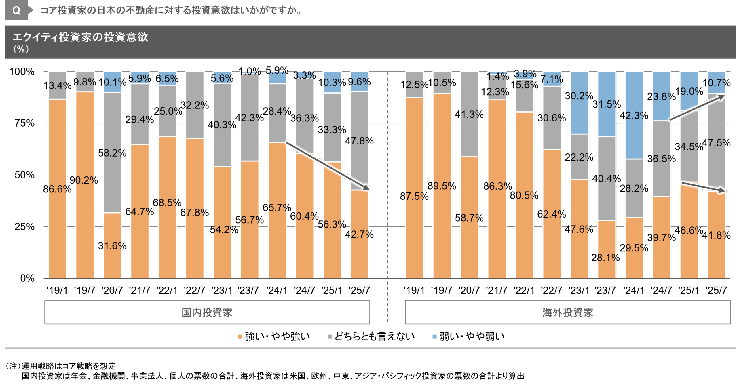 エクイティ投資家(コア戦略)の投資意欲については、海外投資家で「どちらともいえない」の回答割合の上昇が見られた。また、国内投資家で「強い」・「やや強い」の回答割合の低下が見られている。
