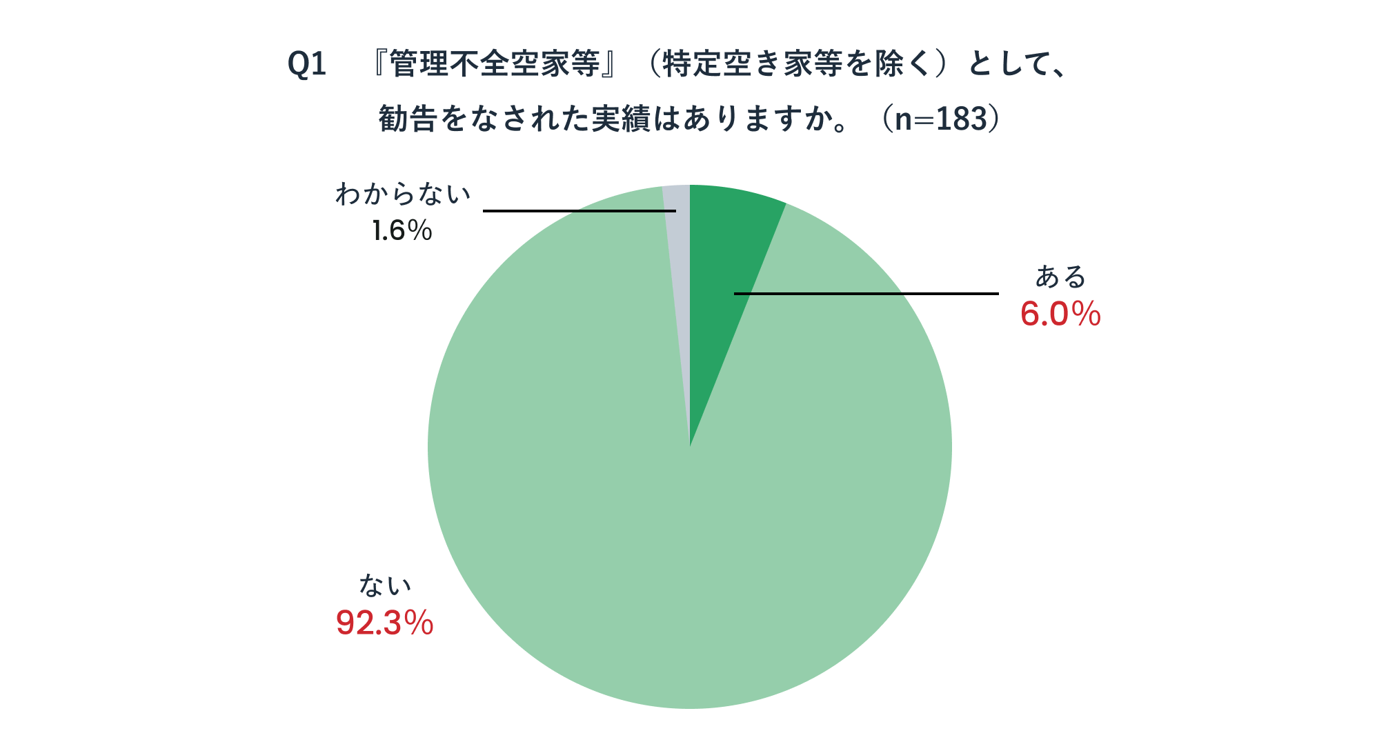 「『管理不全空家等』(特定空き家等を除く)として、勧告をなされた実績はありますか。(Q1)」という質問に対し、「ある」と回答したのは11自治体(6.0%)、「ない」と回答したのが169自治体(92.3%)、「わからない」が3自治体(1.6%)という結果となり、新制度の活用が進んでいないことが分かります。