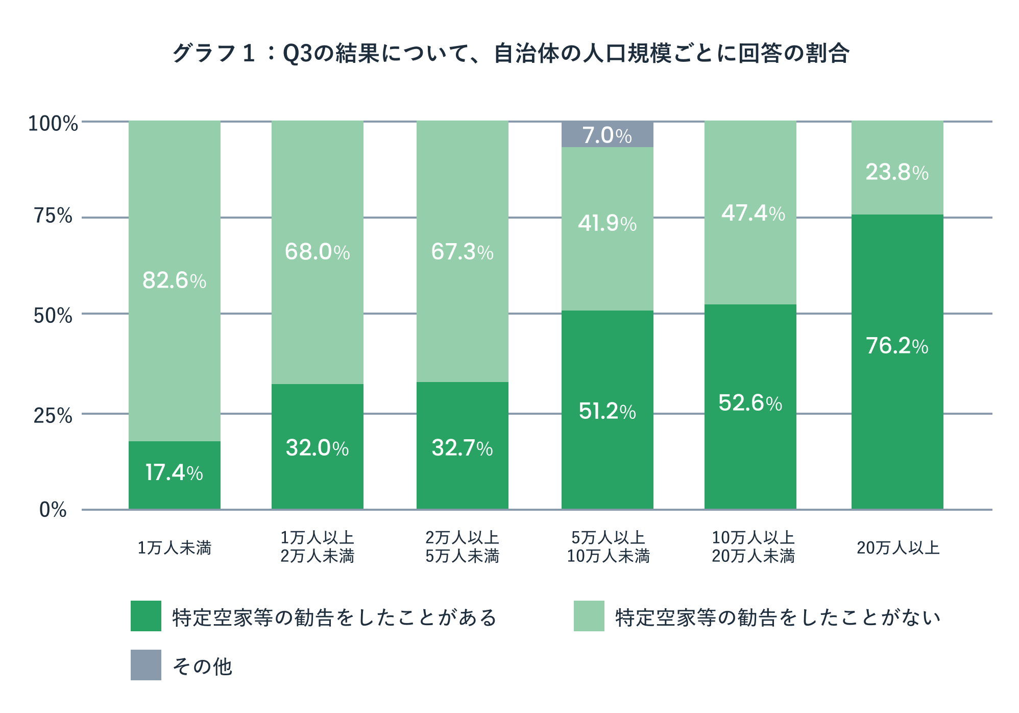 また、Q3の特定空家等の勧告実績の有無に関する内容について、自治体の人口規模ごとに回答の割合を見てみると、自治体の規模が小さいほど勧告の実績がない割合が高いことが分かります。(グラフ1参照)人口規模が小さいほど、住宅数・住宅密度が小さいことで対象となる空き家が少ないことや、空き家対策を他の業務と兼務している等、対応できる人的リソースが少ないことが考えられ、自治体の人口規模や空き家対策担当の体制に沿った支援が求められます。