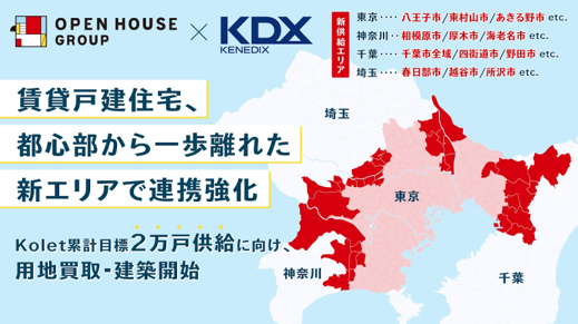 株式会社オープンハウスグループ(本社 東京都千代田区、代表取締役社長 荒井正昭、以下「当社」)は、ケネディクス株式会社(本社 東京都千代田区、代表取締役社長COO 寺本光、以下「ケネディクス社」)が展開する賃貸戸建住宅「Kolet(コレット)」の累計供給戸数目標である2万戸達成に向け、協力体制を構築いたしました。当社グループ会社の中で戸建事業を展開する株式会社オープンハウス・ディベロップメント(以下「オープンハウス・ディベロップメント」)、株式会社ホーク・ワン、株式会社メルディアの3社の戸建事業のシナジーを発揮することで、供給体制を強化し、供給戸数及び供給エリアを拡大します。なおオープンハウス・ディベロップメントの戸建事業において、専ら賃貸戸建向けの用地買取は初となります。