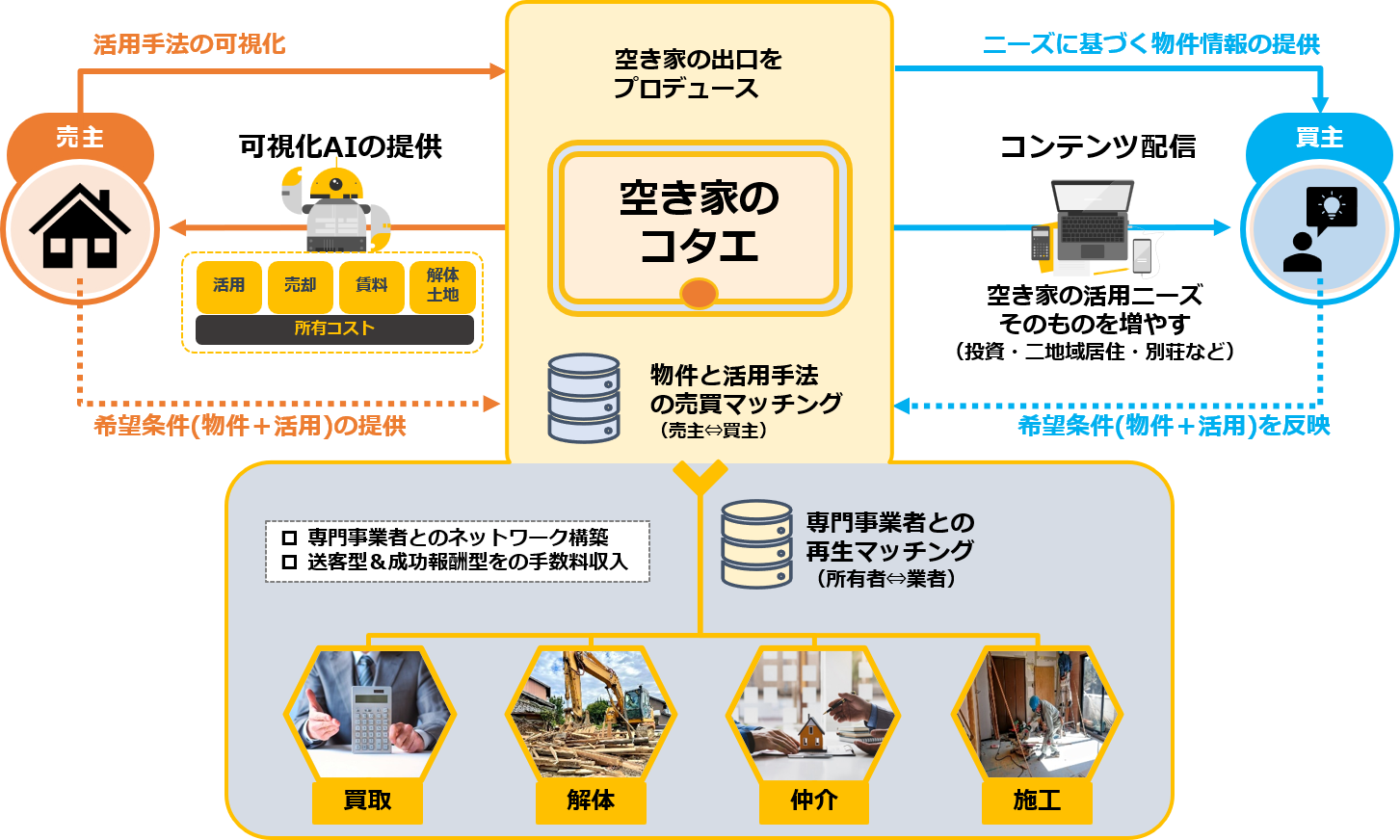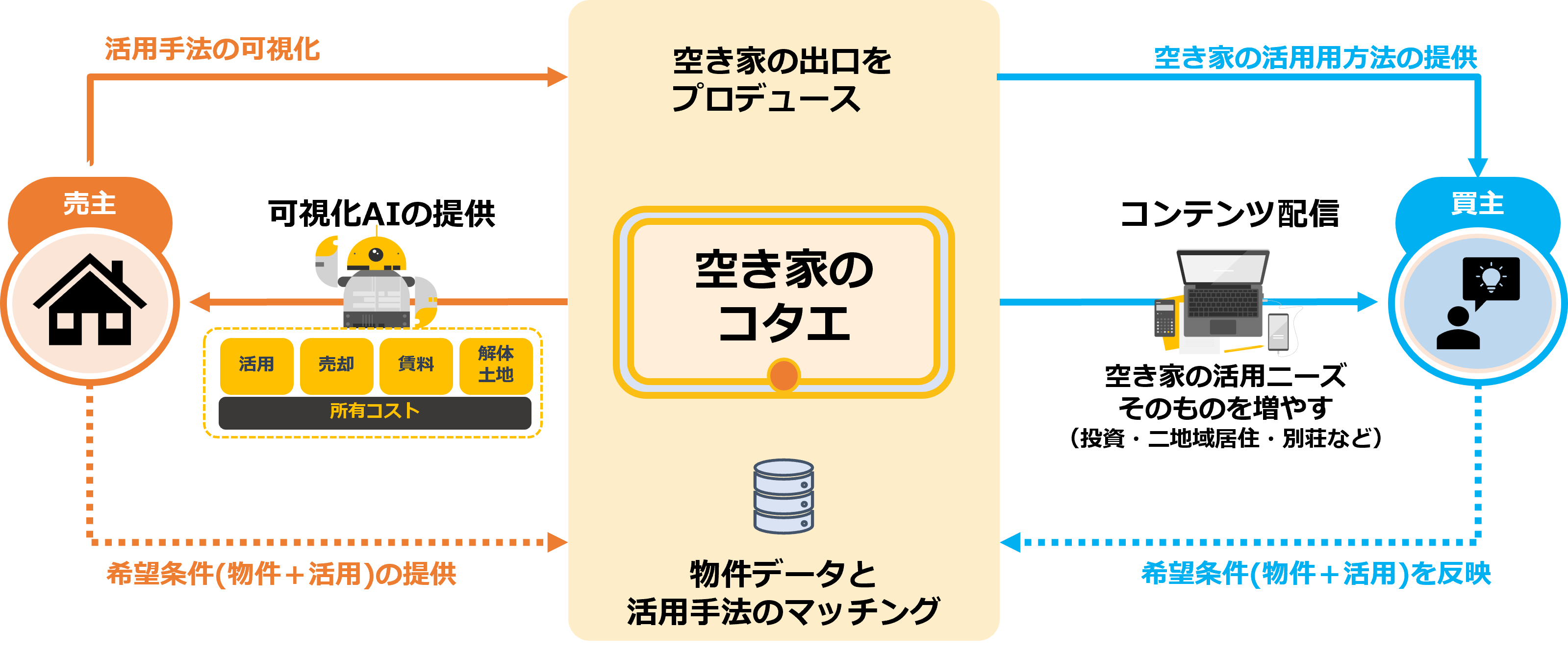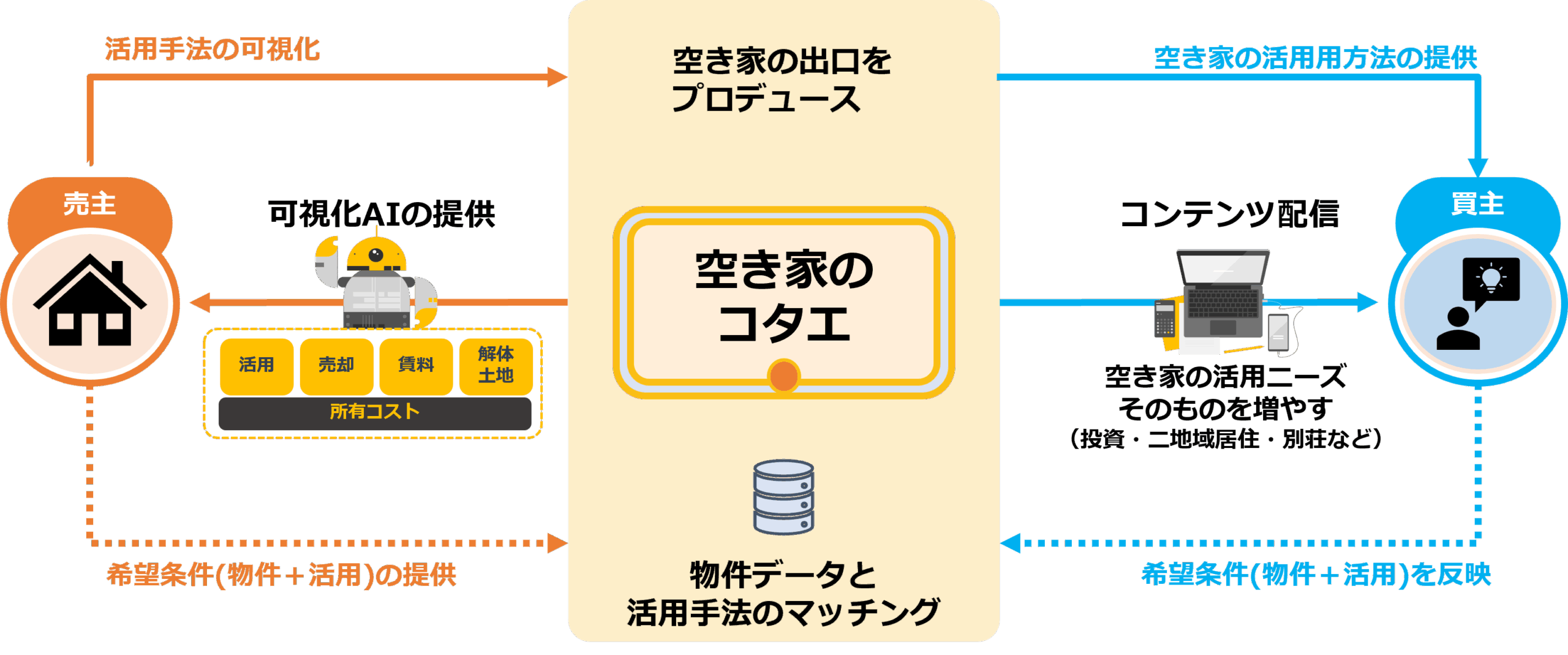 そこでジェクトワンは、これまでの空き家事業「アキサポ」で培った知見とネットワークを最大限に活用し、最新のAI技術を導入しながら、空き家所有者と購入希望者を直接つなぐ新たな空き家流通プラットフォーム「空き家のコタエ」を開発するに至りました。本サービスは、AI技術により、空き家所有者が抱える課題を解決するとともに、購入希望者にとって価値ある空き家物件と出会う機会を創出します。本サービスを通じて、売主と買主双方が円滑かつ納得感をもって取引ができる透明性の高い新たなエコシステムを構築し、空き家市場の活性化を目指します。