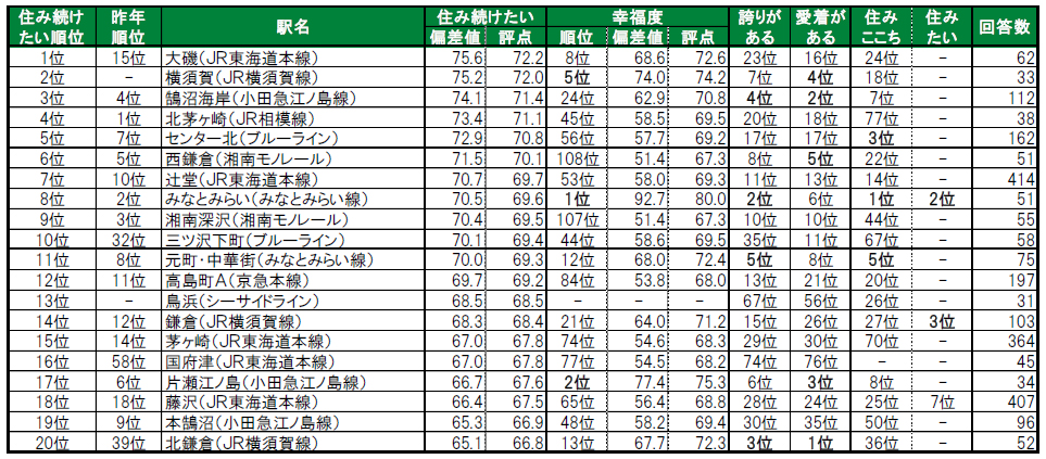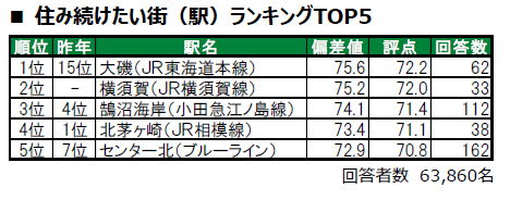 1位は中郡大磯町に位置する大磯で、昨年15位から大きく順位を上げてトップに輝きました。2位は初登場の横須賀市に位置する横須賀で、昨年は累計回答数が30名未満でランキング集計対象外だった駅です。3位は藤沢市に位置する鵠沼海岸で、昨年4位から一つ順位を上げてトップ3入りしています。