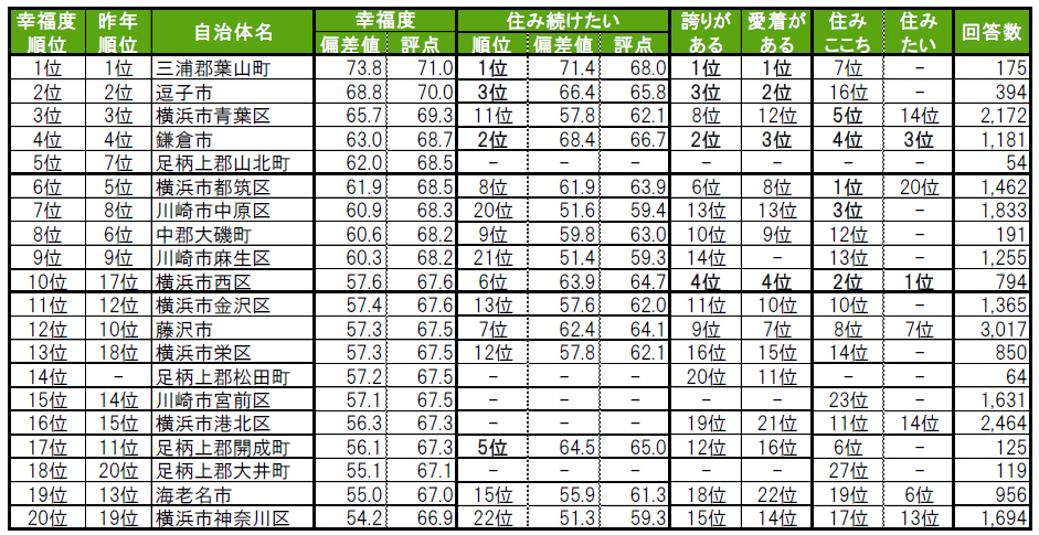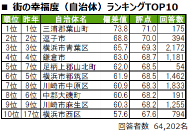 ■街の幸福度(自治体)トップは、4年連続で三浦郡葉山町