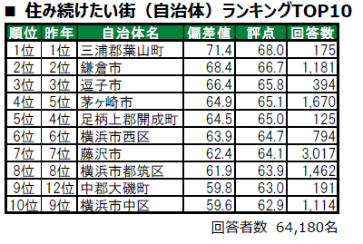1位は4年連続で三浦郡葉山町で、唯一偏差値70台の高い評価を得ています。2位は2年連続で逗子市、3位は3年連続で横浜市青葉区です。トップ10内では、10位の横浜市西区が、昨年17位から順位を上げてトップ10入りしています。