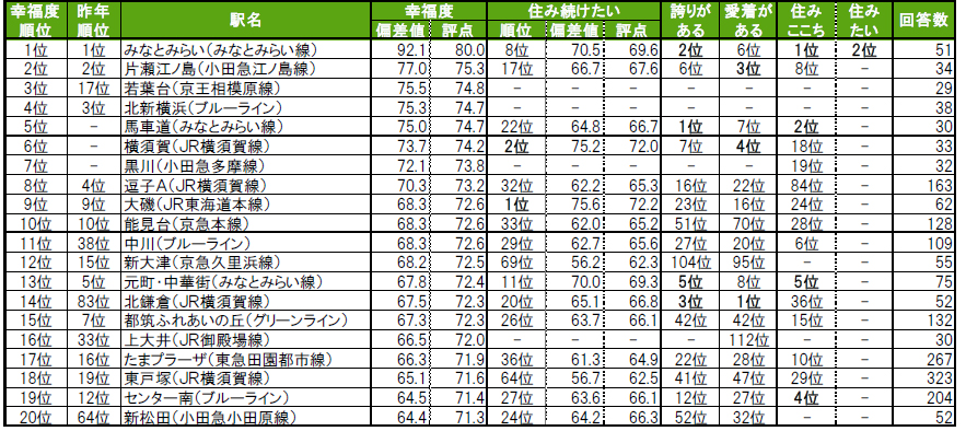 ●トップ20内では、昨年83位から14位に大きく順位を上げた北鎌倉が新たにランクインしています。北鎌倉は、「街に愛着がある」で1位、「街に誇りがある」で3位となっている駅です。その他、16位上大井(昨年33位)、20位新松田(昨年64位)、が昨年より順位を上げてトップ20入りしています。●1位のみなとみらいは偏差値90台の極めて高い評価、2位~8位の駅は偏差値70台の高い評価、9位~20位の駅は偏差値60台で相対的に高い評価となっています。